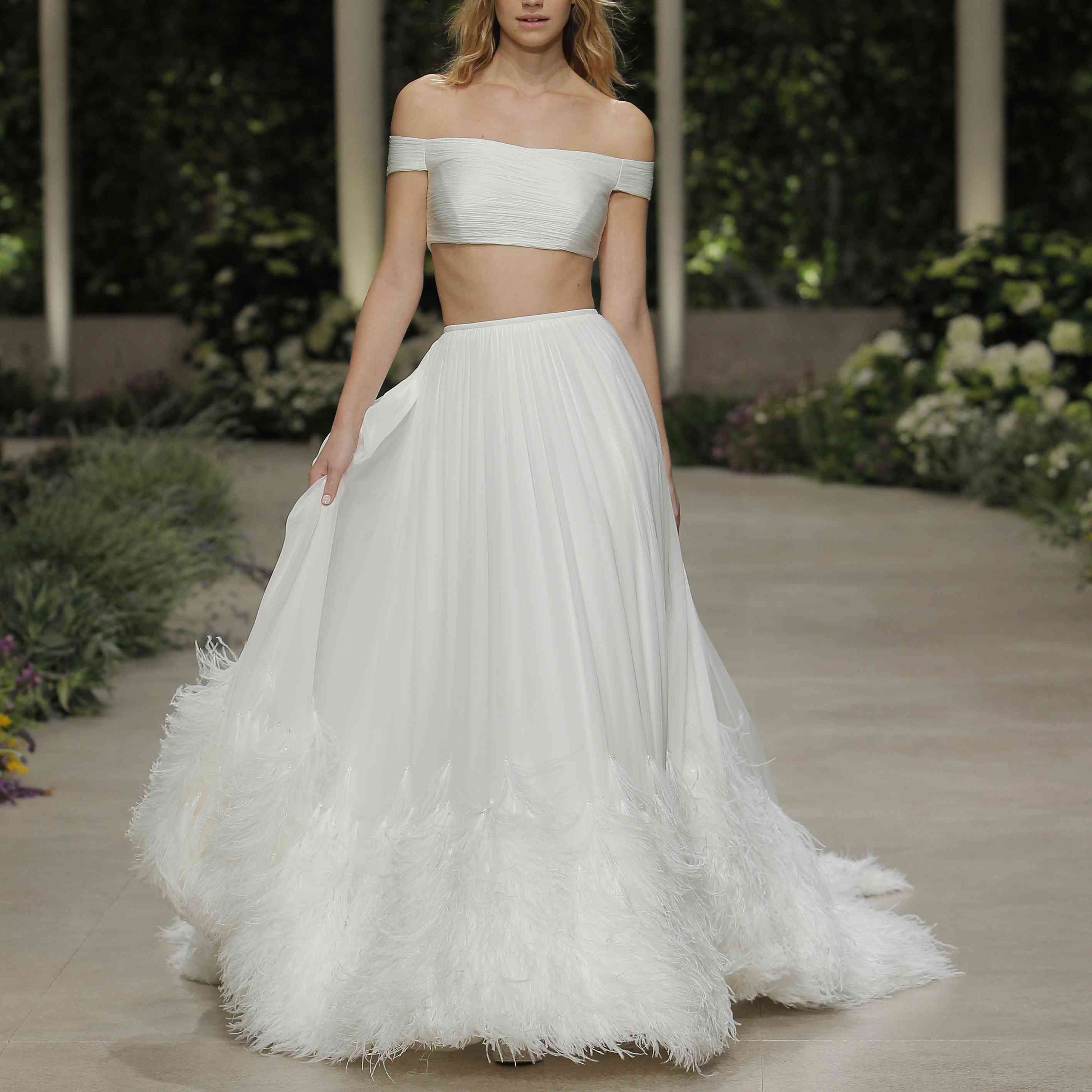 “Ava”露肩舞会礼服与夸张的褶皱列。