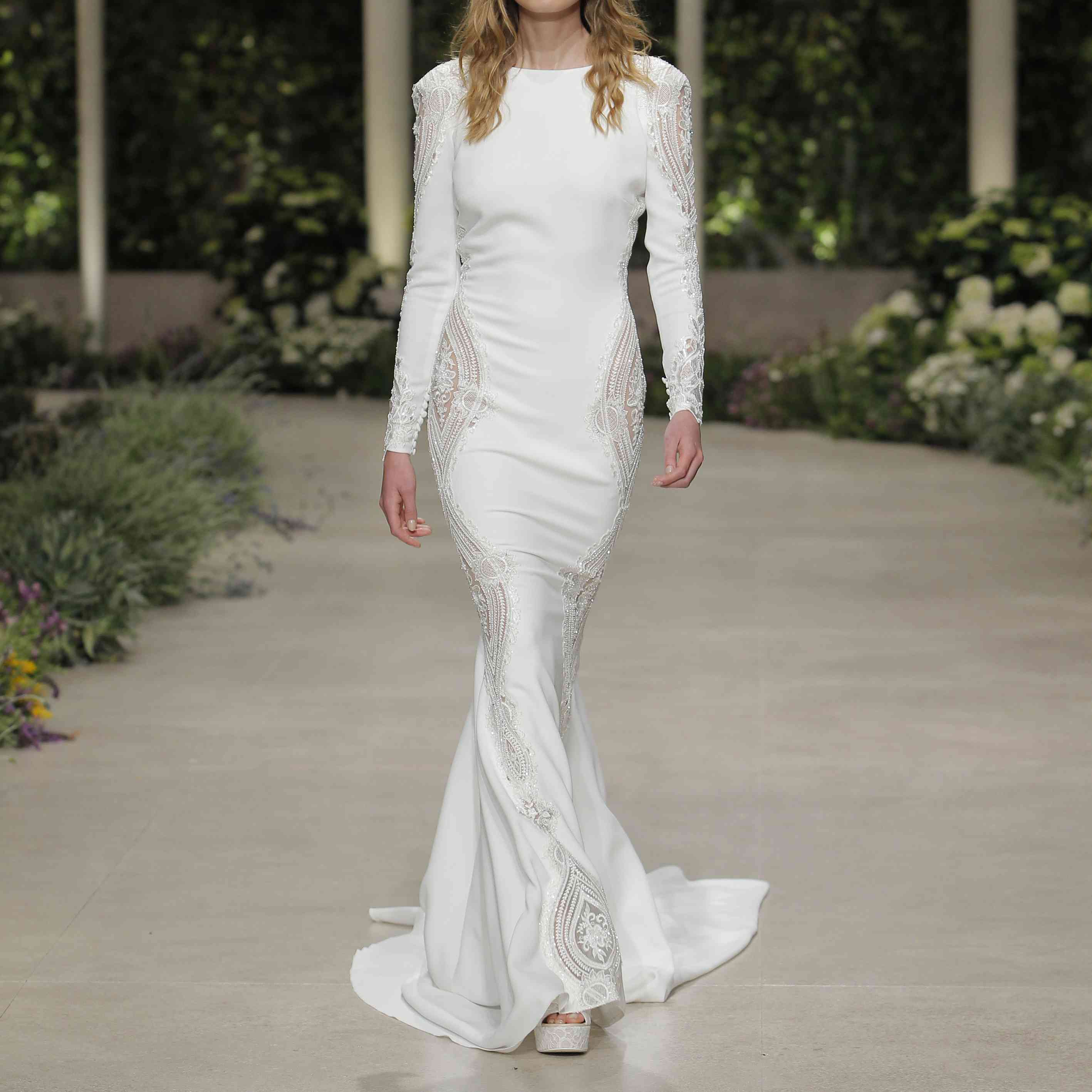 “卡塞雷斯”长袖,绉美人鱼礼服搭配V领蕾丝镶板。