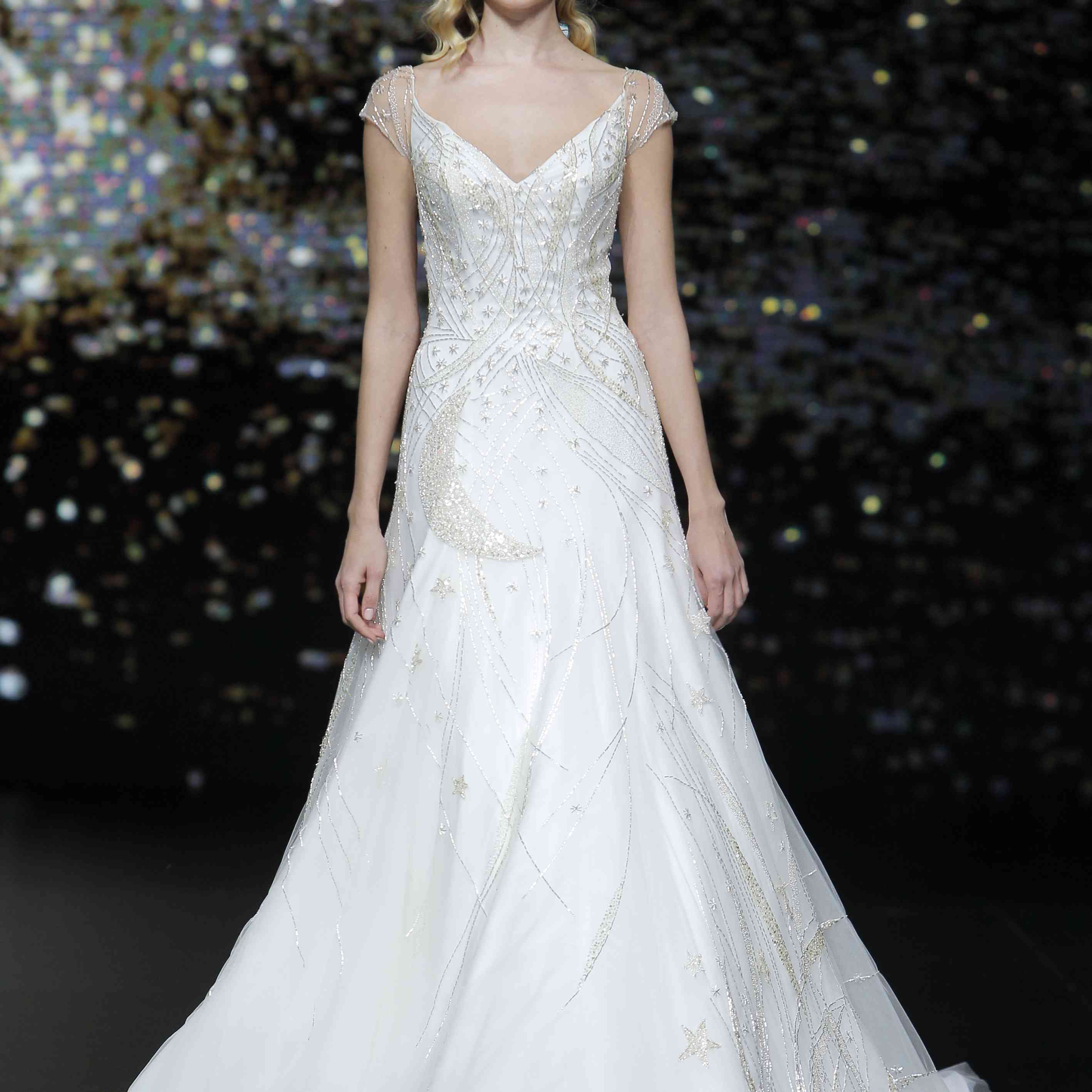 “星座”点缀薄纱婚纱礼服与暴跌领口。