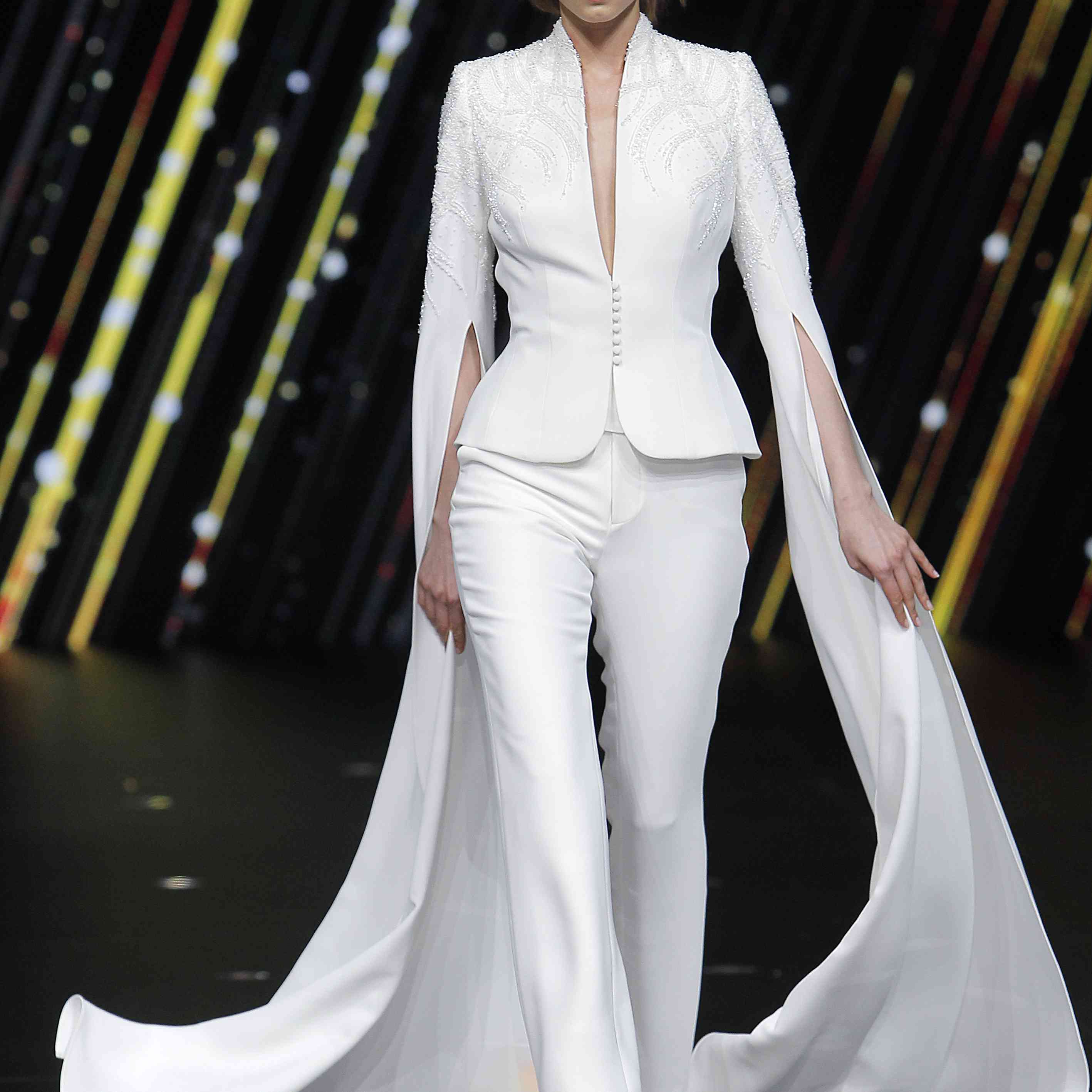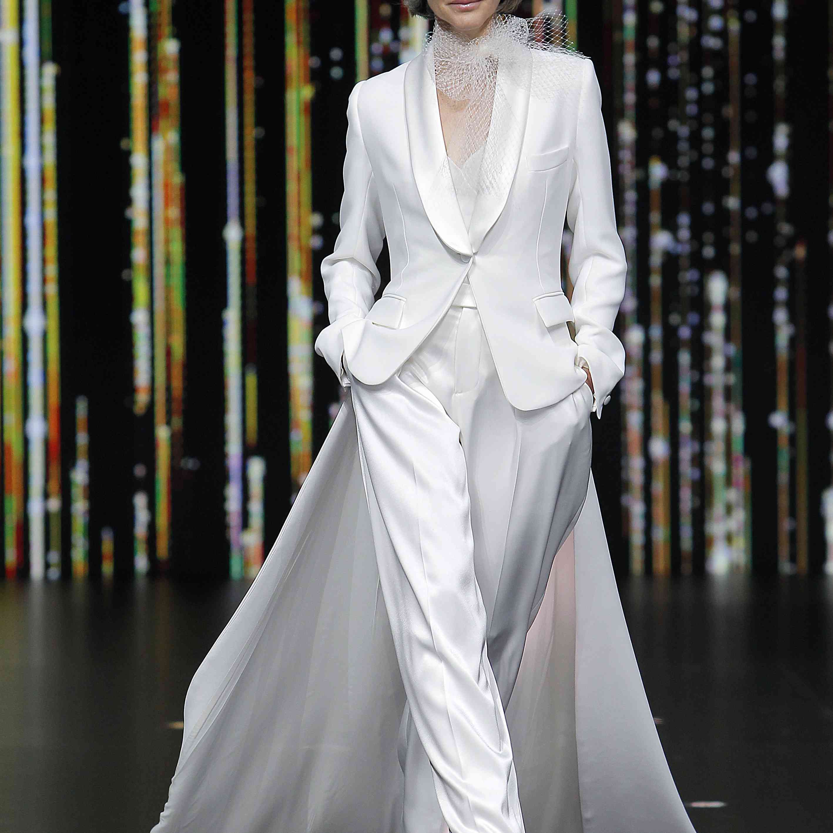 “旅行者”新娘裤装与上衣,裤子,和火车。