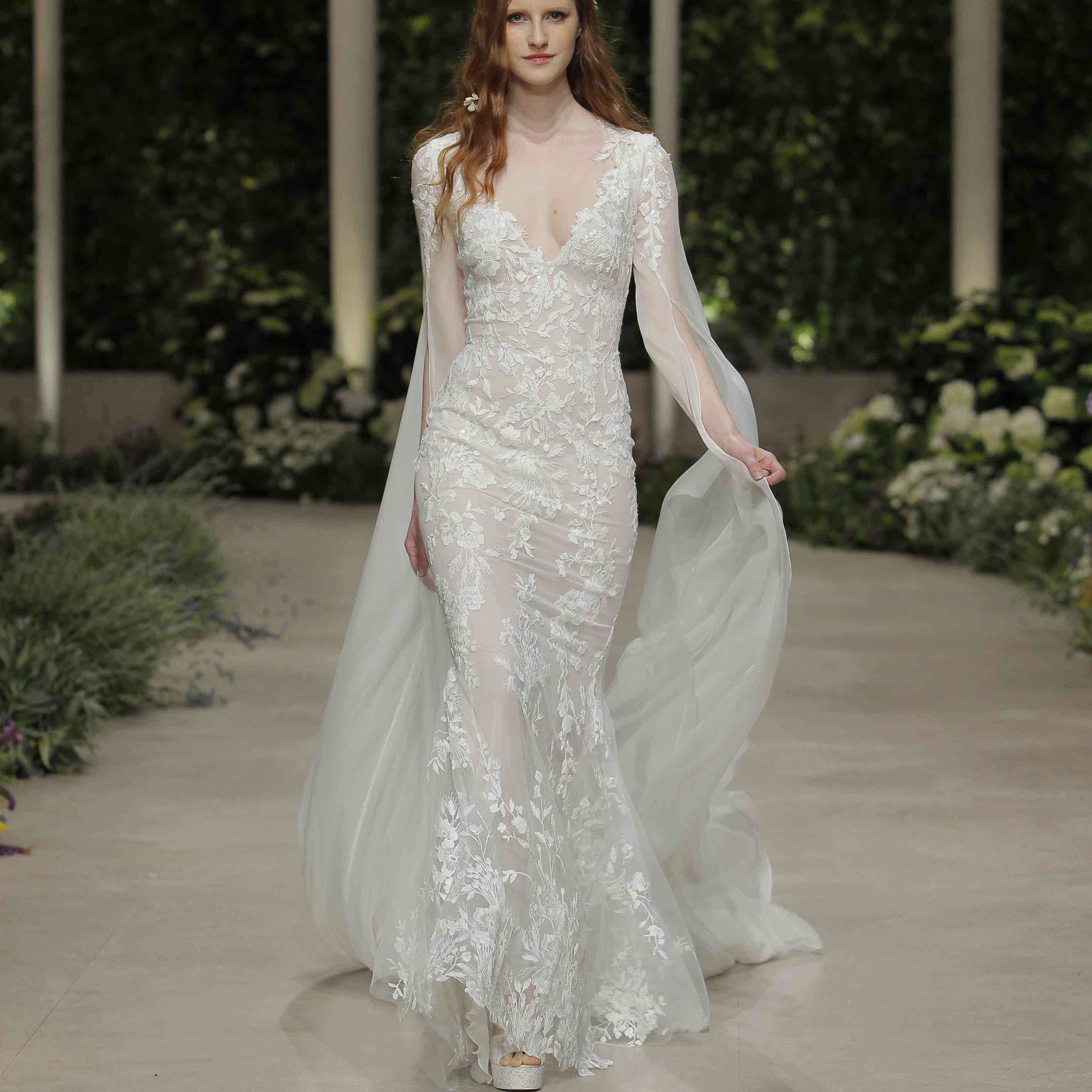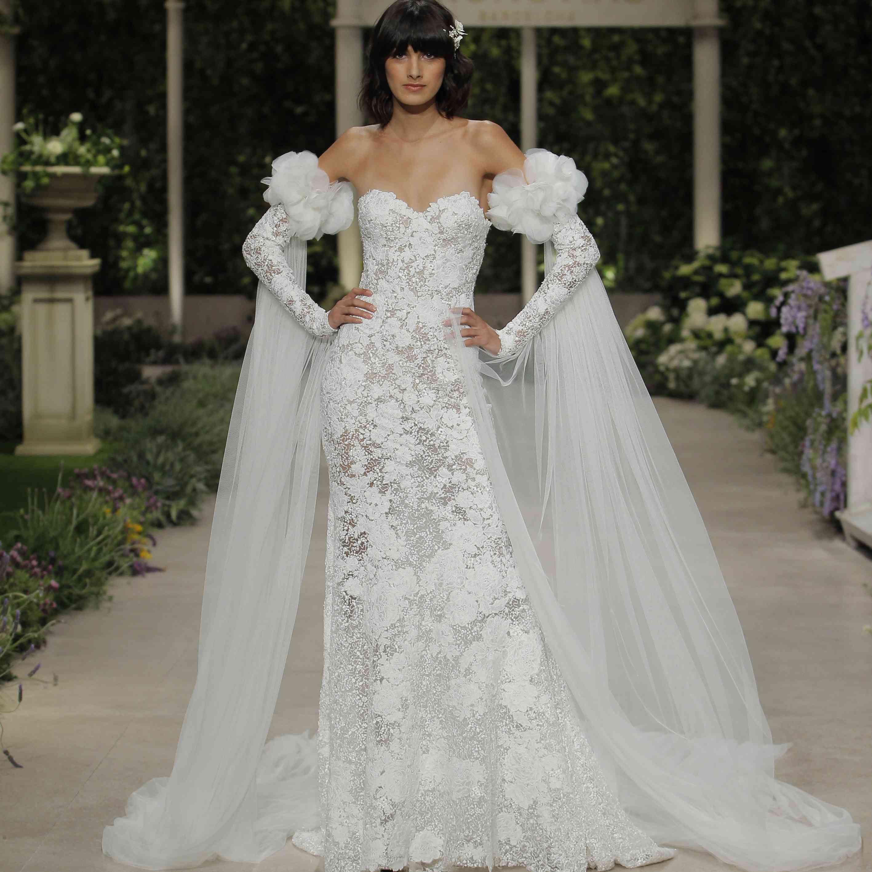 “星际”蕾丝婚纱V型领口,长袖,和薄纱细节。