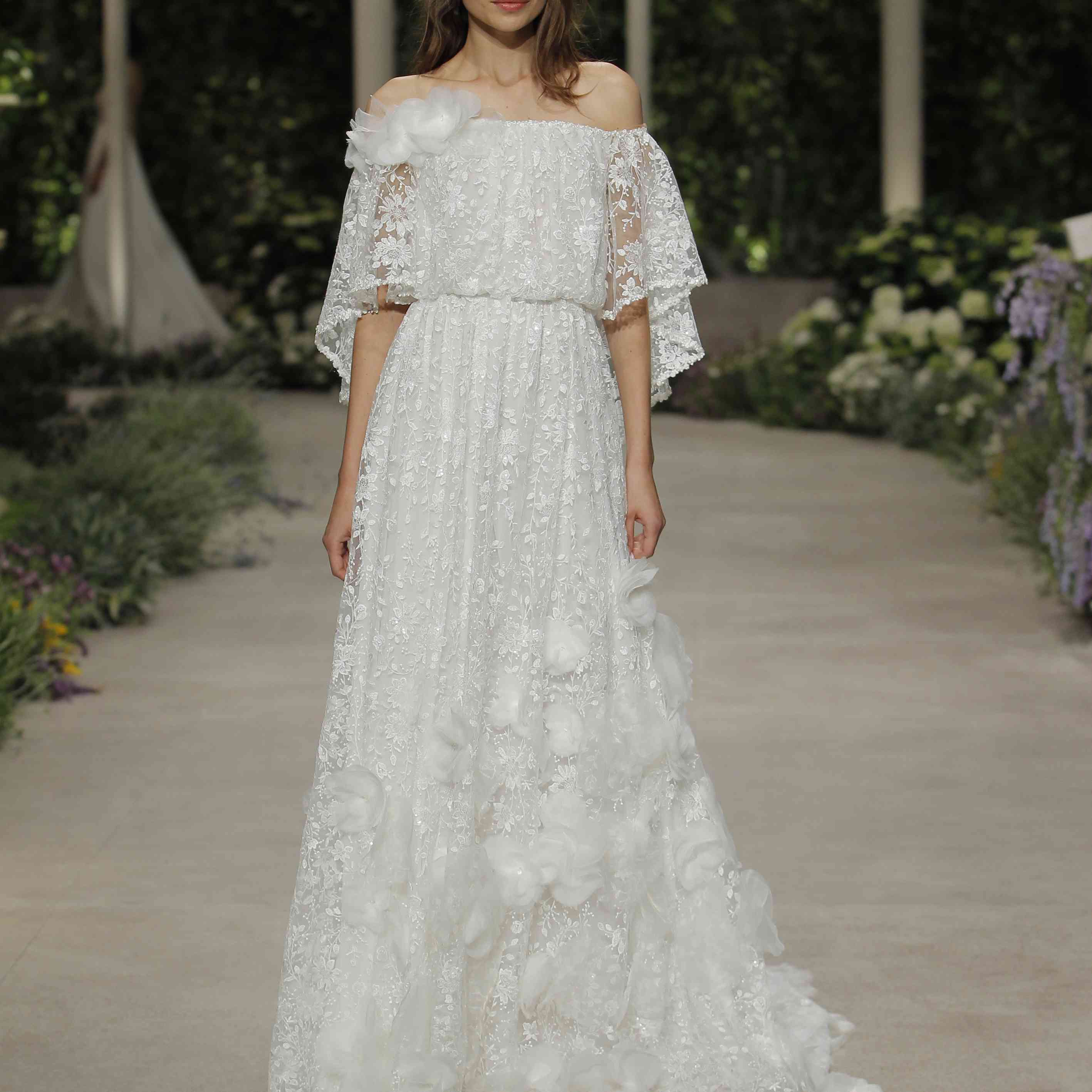 “卡琳”现成的肩,绣花薄纱礼服用3- d花。