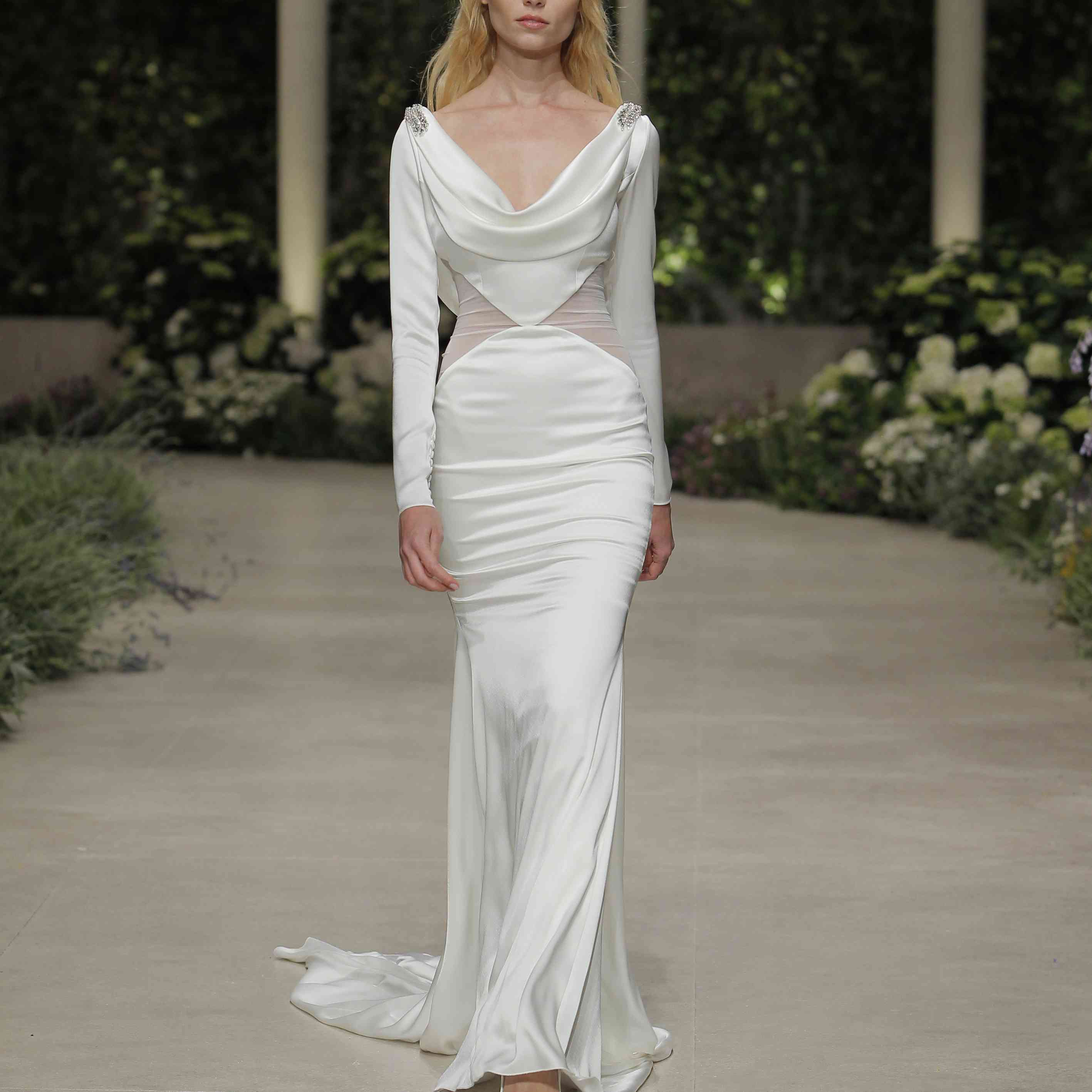 “卡米拉”绉,长袖美人鱼礼服侧狭缝和小舟领口。