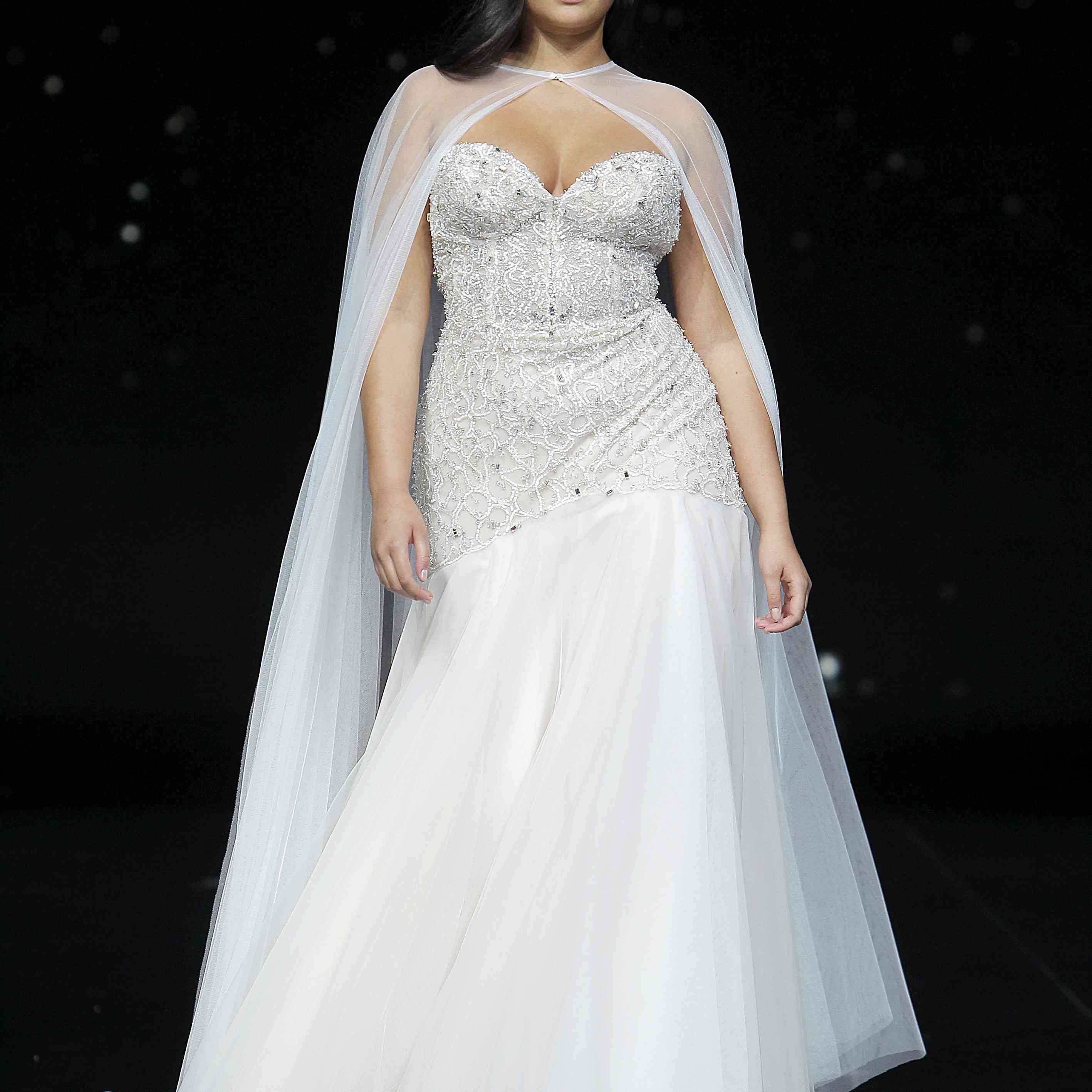 “日间”无肩带婚纱与串珠胸衣,薄纱裙,斗篷。