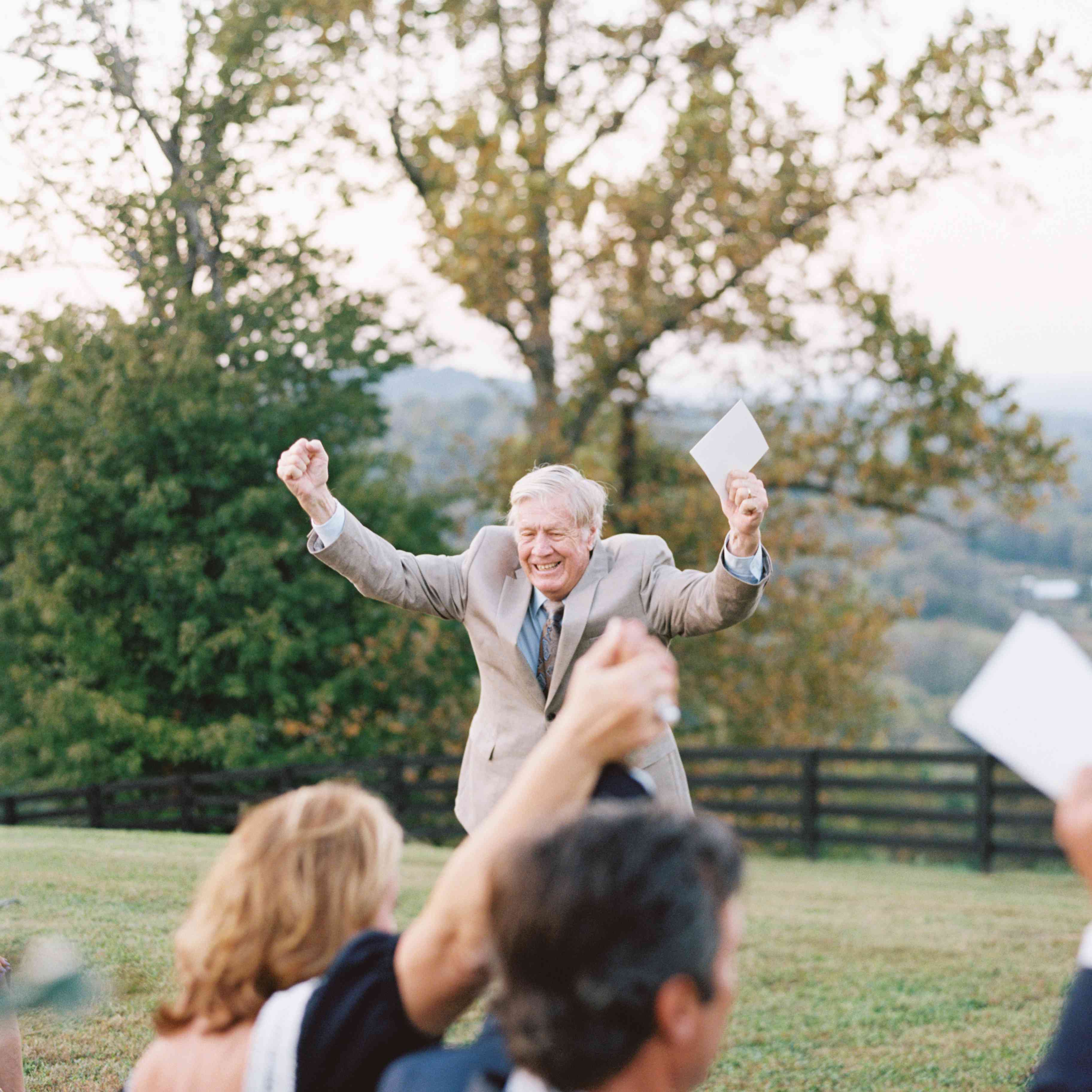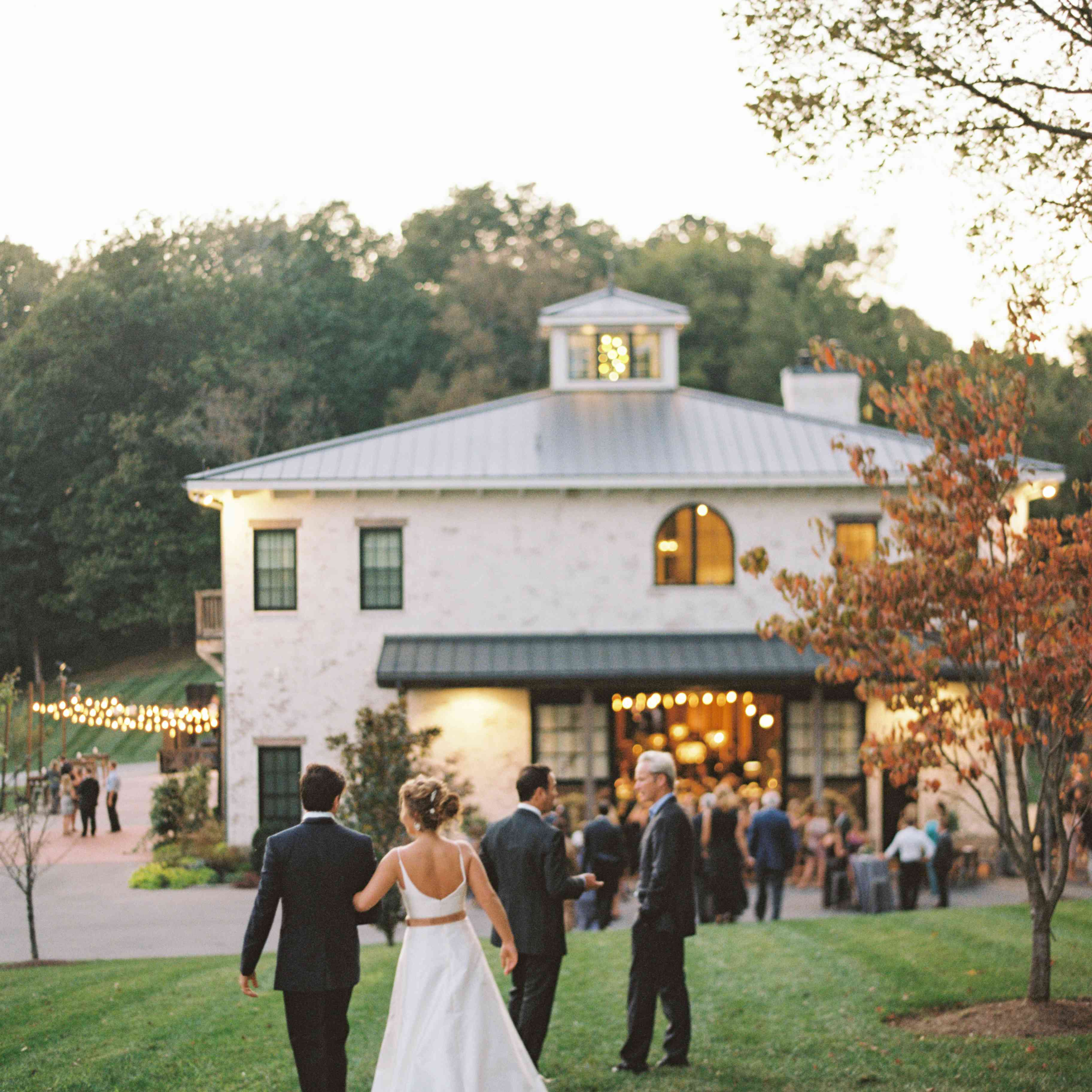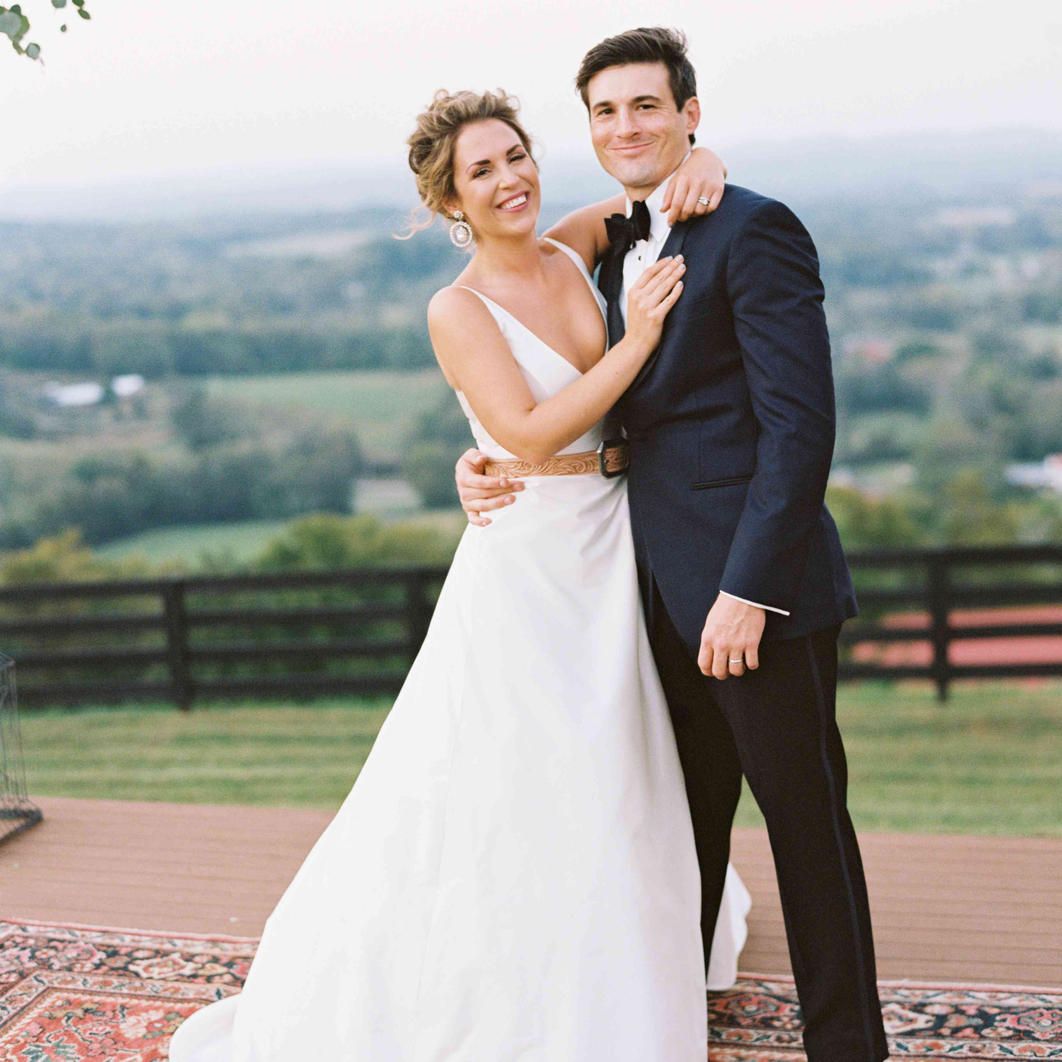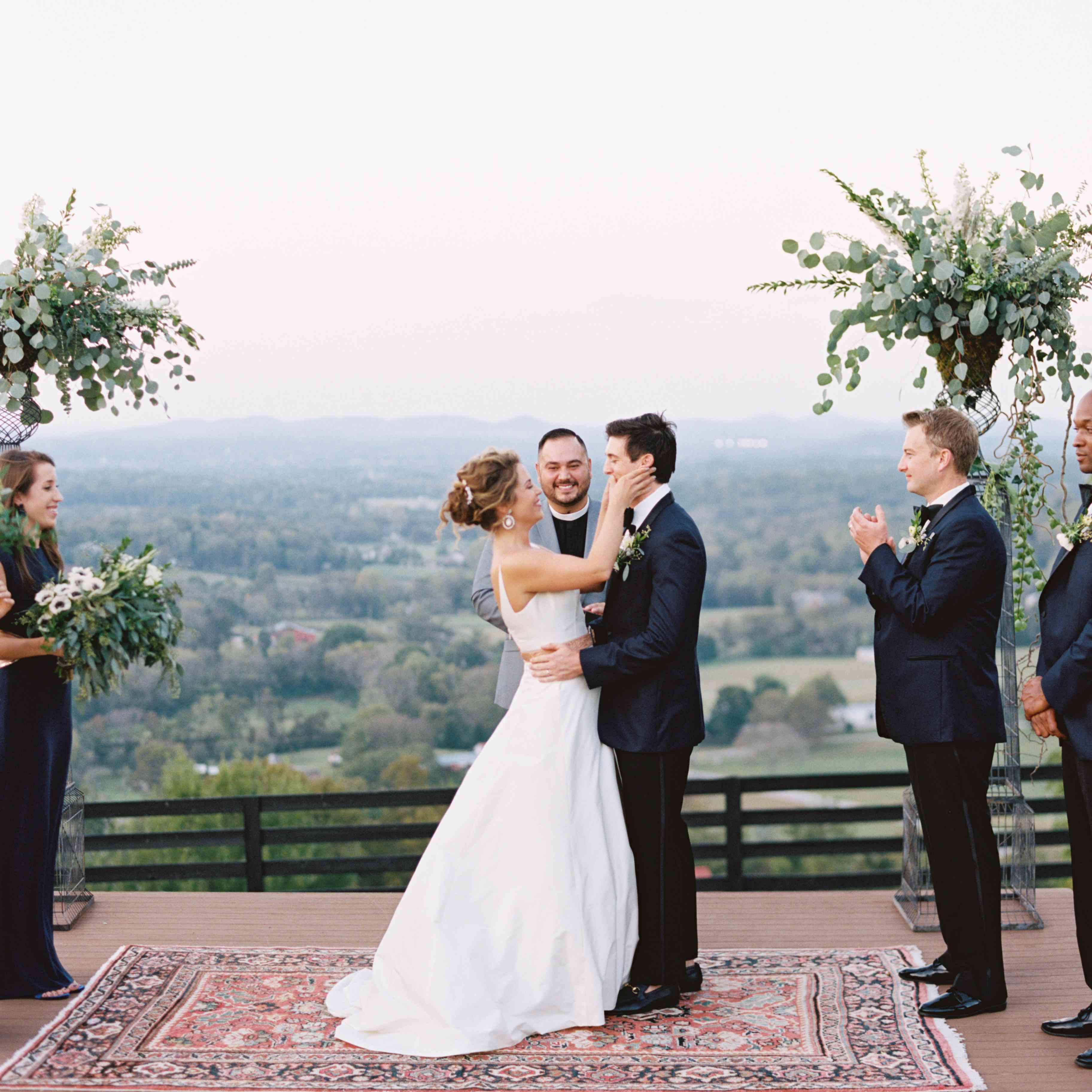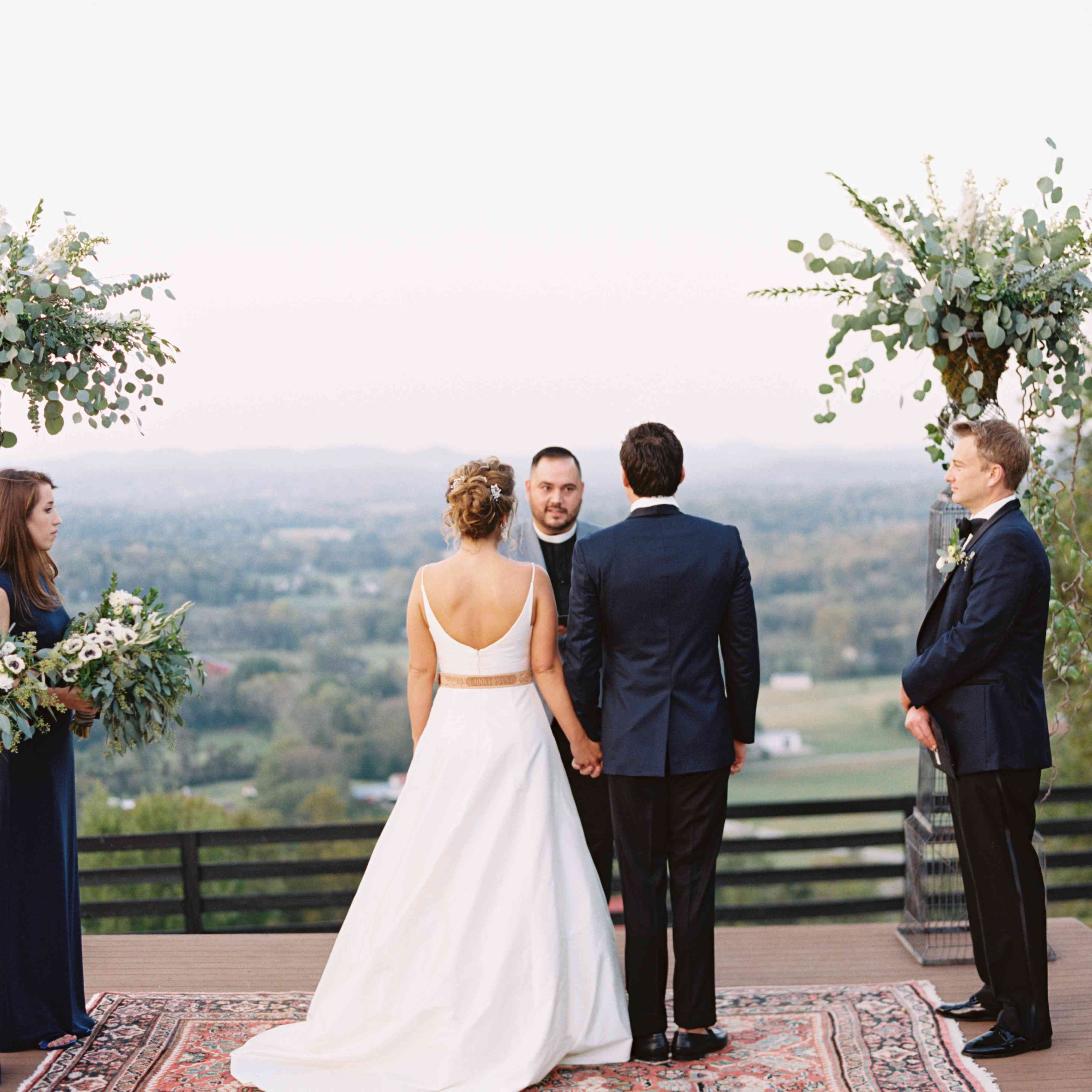 在夕阳西下的山顶上,艾丽和马克在220名宾客的簇拥下说了“我愿意”。这对夫妇站在一个凸起的平台上,两侧是田纳西山腰的全景,上面装饰着一块东方地毯。两个带花的超大瓮环绕着平台,通道两旁是白色木制英国木盒状的木兰树。