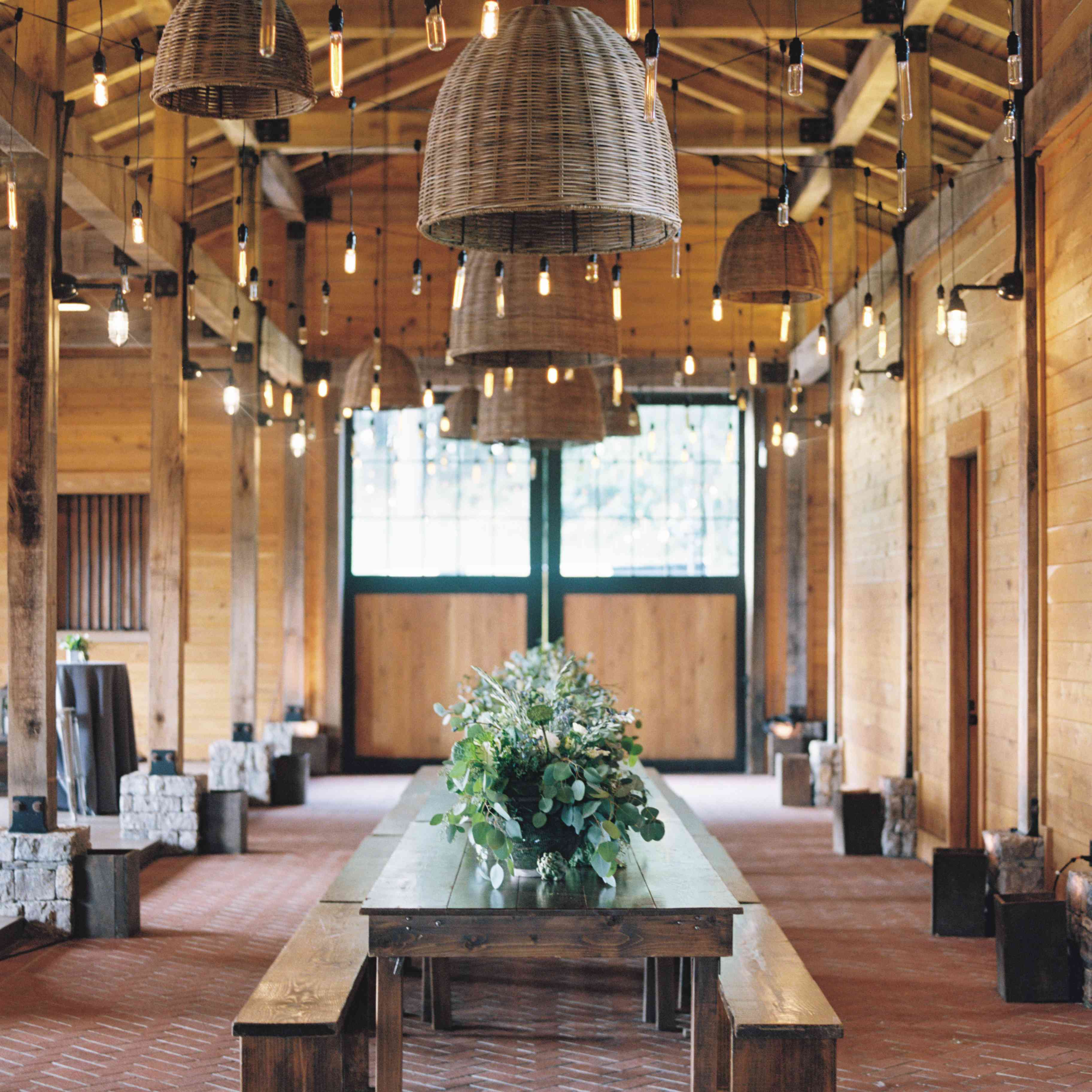 在谷仓里面,为家庭式座位安排了木制农场桌子,每个都配有绿地充满了原料的铁花瓶。各种各样的超大篮子灯笼装饰了上面的天花板梁,而桌子穿着灰色的亚麻布,抛光的金凳,下面的陶油站。