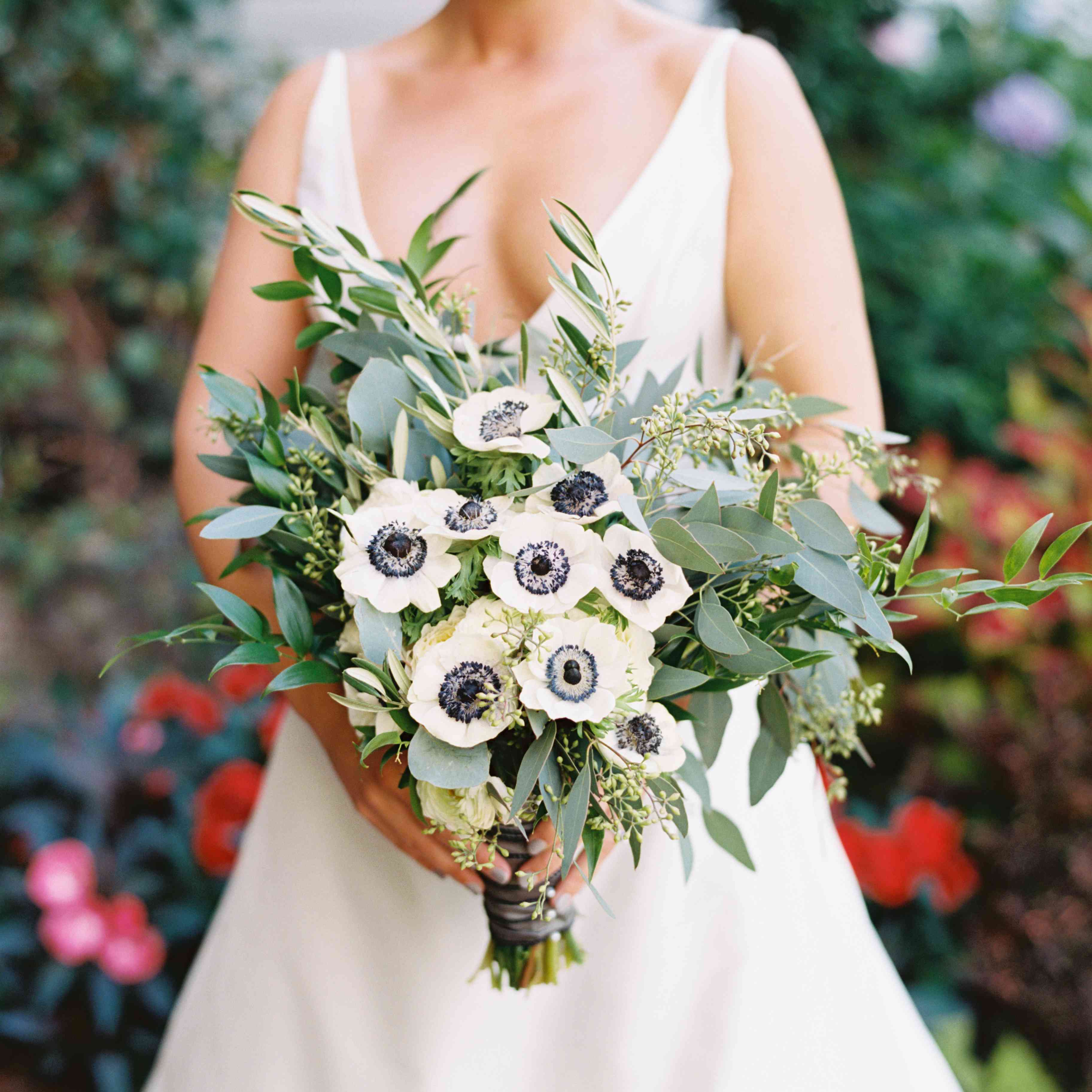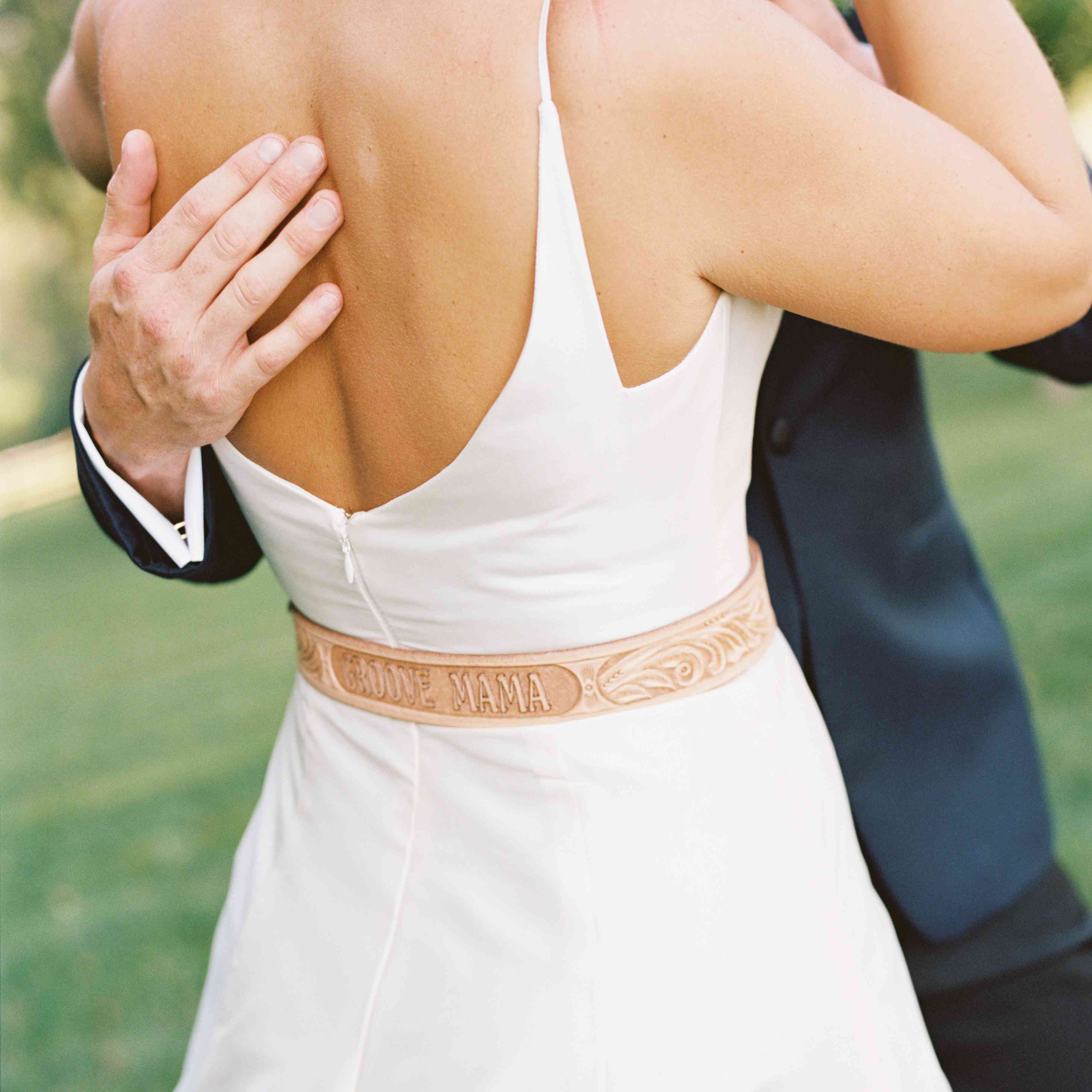 作为一个颂新娘的绰号出于对音乐的迷恋,她佩戴了一条手工制作的皮带,上面写着“Groove Mama”。她还戴了一对从她姑姑那里借来的古董莱茵石和珍珠耳环。“他们是她第一次带过来尝试的,他们很完美,”Elle回忆道。她的花束包括一束令人惊叹的白色熊猫海葵和桉树种子,伴娘们带着同样的小花束。男士胸花也相匹配,每个胸花上都有一只熊猫海葵、桉树和银色布鲁尼花。