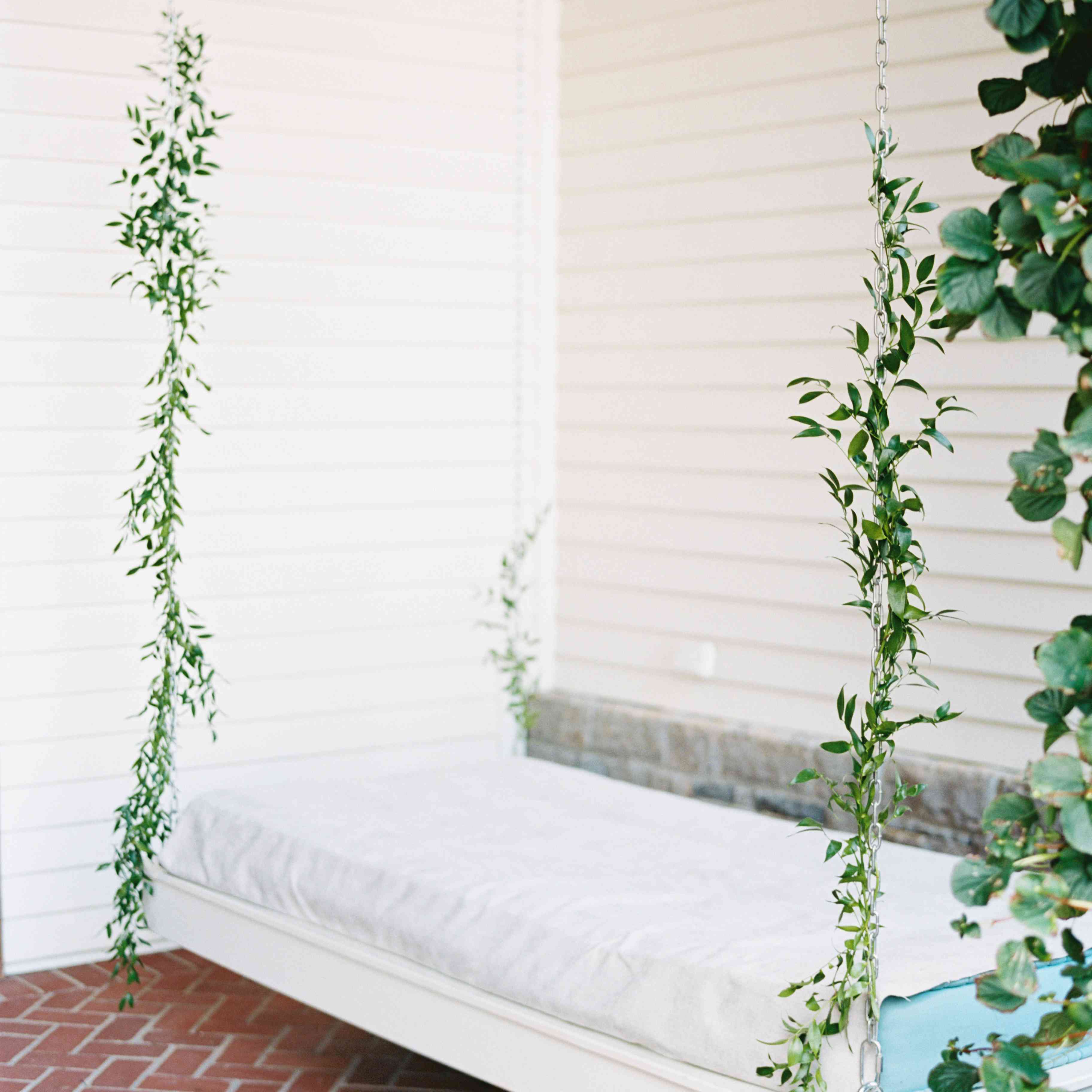 这对夫妇定制的婚礼盾牌和字母组合被做成了装饰性的枕头,放在农场的摇椅床上。