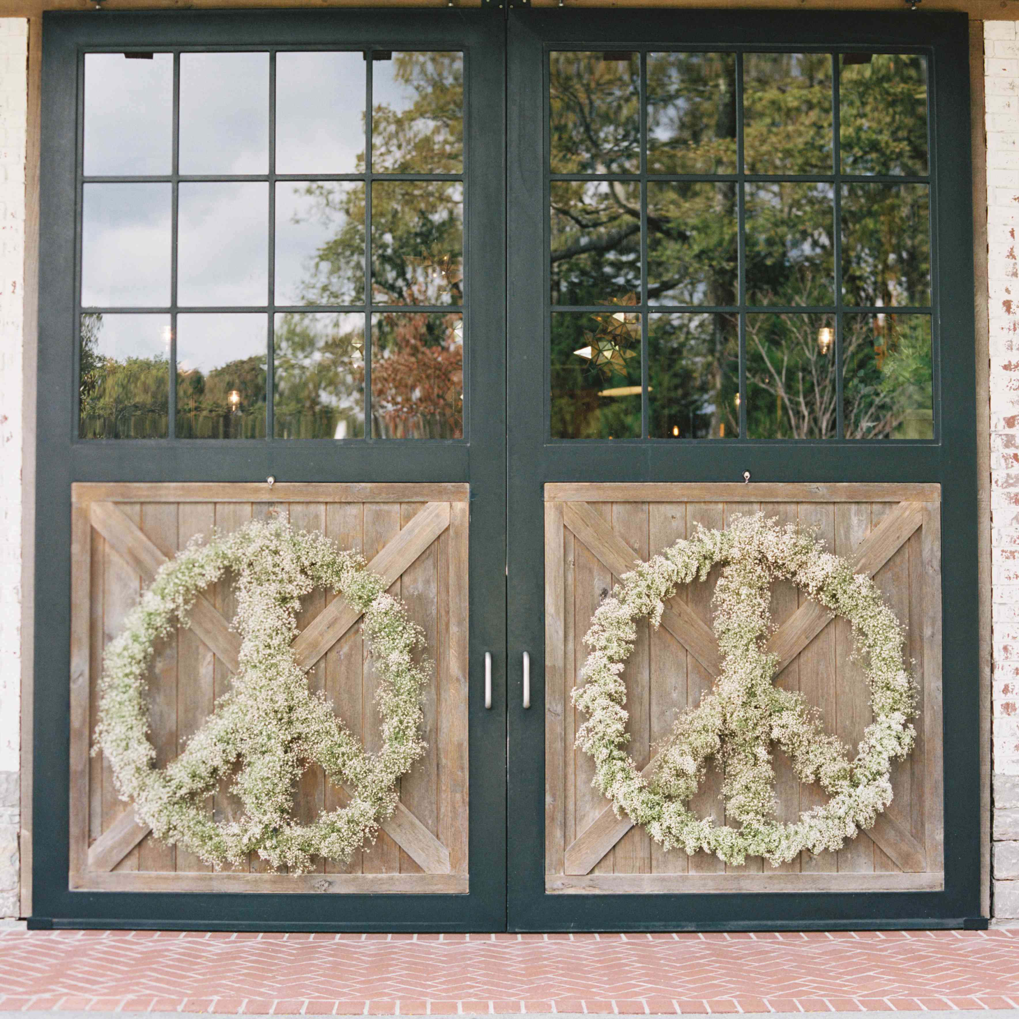 向新婚夫妇致敬'音乐节的喜爱,他们的花店附有两个巨大的和平迹象,在接待场上滑动双层农场门。