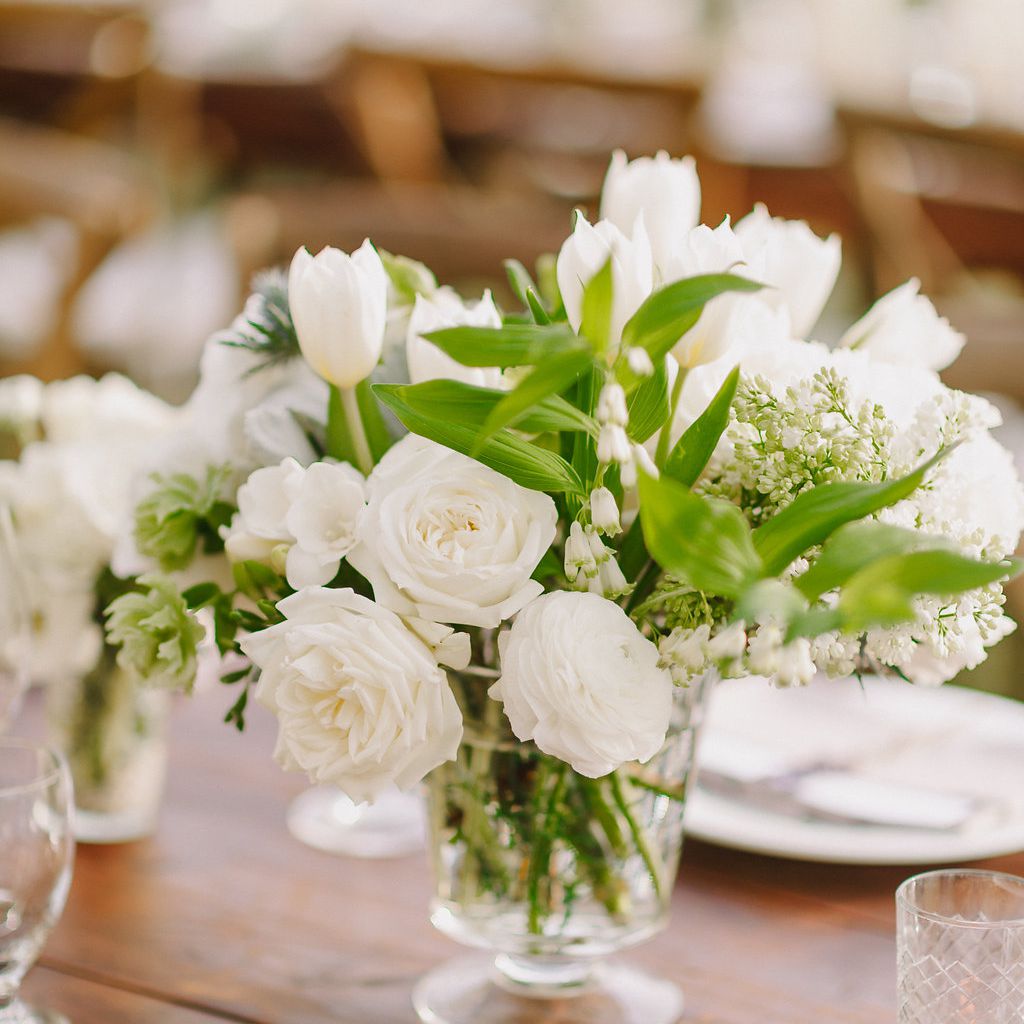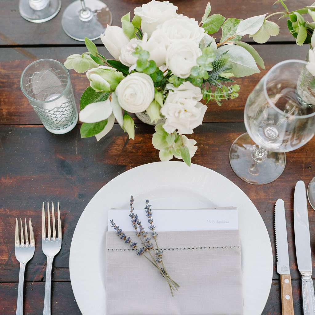 餐桌上的装饰用白色绣球花、玫瑰、郁金香、柱子和蜡烛组成。柔软的灰色亚麻餐巾上面有多肉植物或薰衣草小枝。菜单上有菲力牛排、虾和玉米粉,特色鸡尾酒是卡瓦和阿诺德·帕尔默斯——非常适合高尔夫球场!