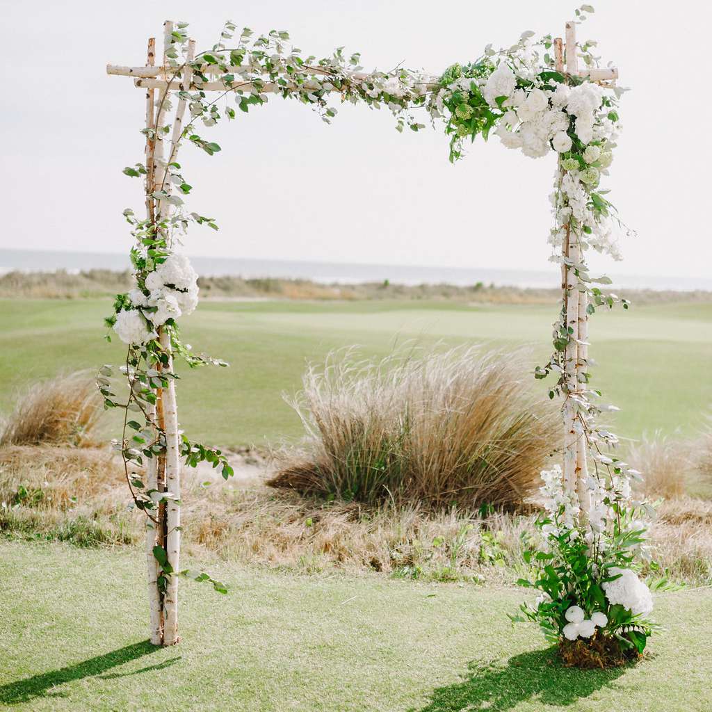 的仪式通道上摆满了飓风花瓶充分海草。由桦树树枝制成的拱门本身覆盖着毛茛属,绣球花,玫瑰和甜豌豆。