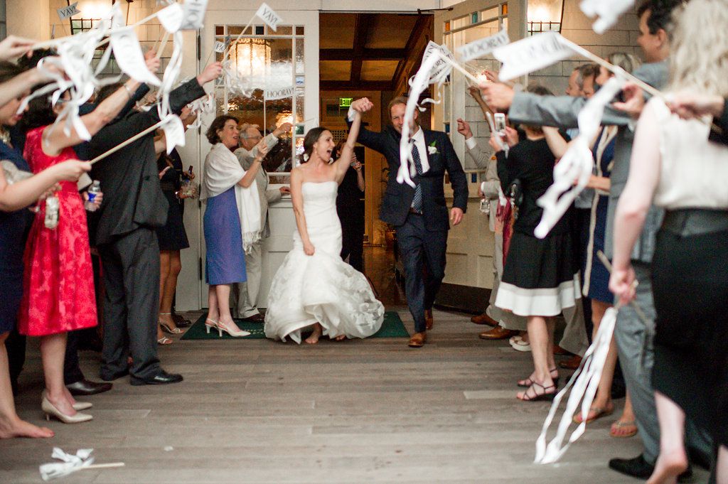 在夜晚结束时,新婚夫妇在飘带和横幅读“万洞!”和“恭喜!”