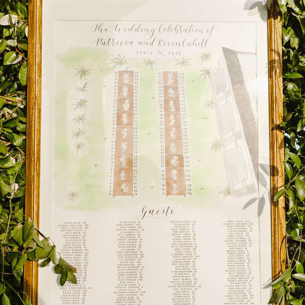 客人们发现,他们的座位上没有陪同卡片,而是挂在绿色植物墙上的定制水彩画图。露天晚餐是在俱乐部旁边举行的,可以俯瞰搭着跳舞帐篷的草坪。