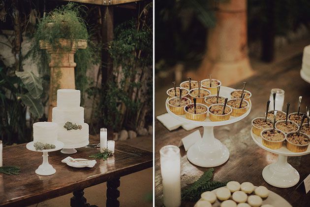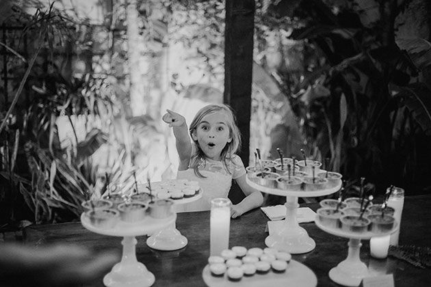 甜点包括一个三层杏仁婚礼蛋糕与香草奶油和迷你糖果的选择。一个花童几乎无法抑制她的兴奋看到颓废的蔓延!