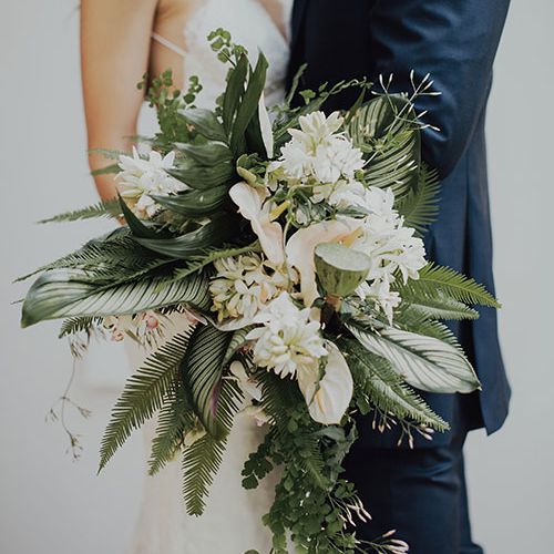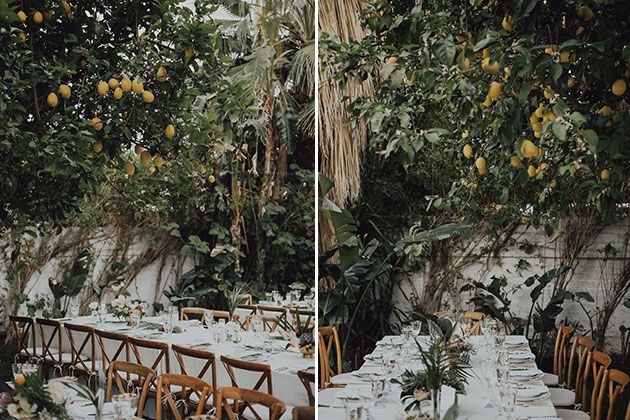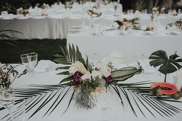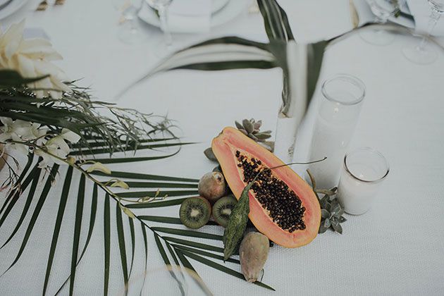 当谈到他们的招待会décor时,新娘只明确了一件事:绝对不要玫瑰。“我不喜欢过于甜美或过于完美的花朵,但我更喜欢狂野、热带、不对称和纹理的安排,”杰西卡说。“我们使用了沙漠花、甘美芬芳的茉莉花、奇异的红掌和嚏根草,以及充满活力的热带水果切片,创造了一个郁郁葱葱的绿洲。”
