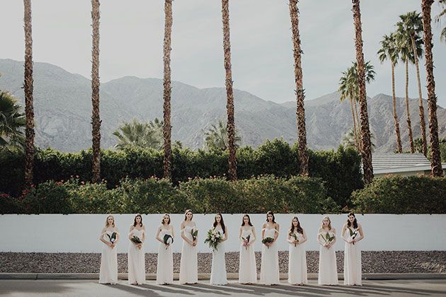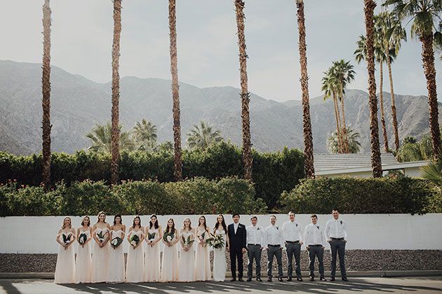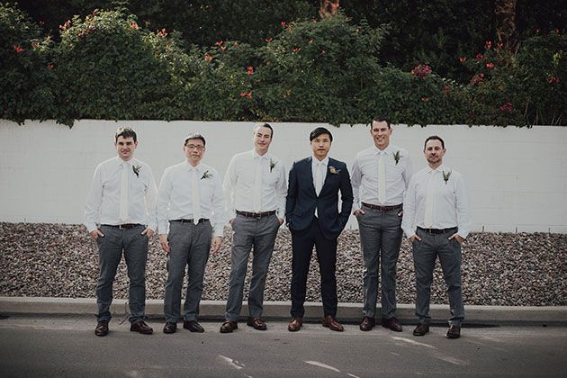 这对夫妇分享了一个私人第一次看到然后和他们的结婚派对碰面,为他们拍婚纱照。帕特里克的伴郎们都穿着与新郎相配的灰色裤子、白色衬衫和丝绸领带。“他们看起来干净又轻松,”杰西卡说。“我们觉得没有必要让我们的朋友在沙漠的炎热中穿西装,我们喜欢没有晚礼服的休闲外观。”