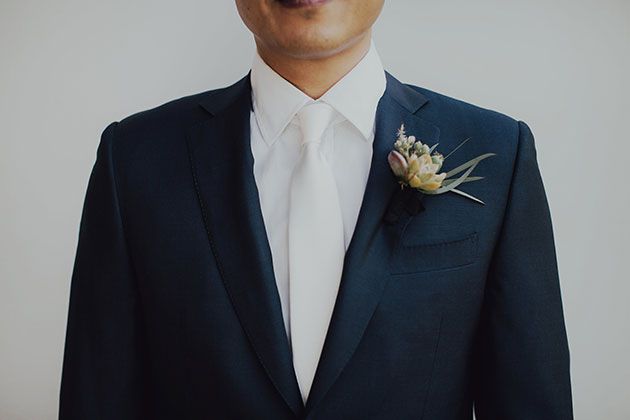 新郎身穿Canali深蓝色西装,搭配白衬衫和丝绸领带,看上去很迷人。就像他新娘的花,帕特里克的Boutonniere.引导着棕榈泉的美学:一株空气植物、茉莉花和一株迷你多肉植物是他服装的完美点睛之笔。