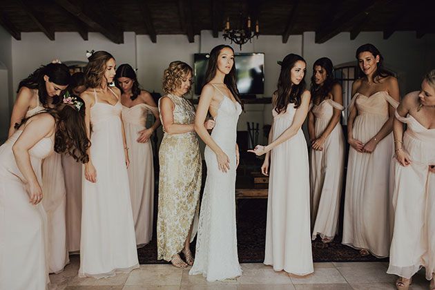 新娘和她的9个伴娘一起花了一个上午准备婚礼,她们都穿着粉红色的花袍。杰西卡说:“就在婚礼前,我还送给每个女孩一个定制手镯,这是我和我的珠宝生产线上的柬埔寨手艺人合作伙伴专门为她们制作的。”每只手镯都包括一个compass-shaped吊坠还有一张卡片,上面写着:“没有你,我会迷失自我。”无论我们的旅程朝着哪个方向,我们都将永远联系在一起。”