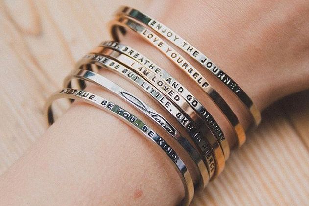 用一个甜蜜的肯定来表达你的感激之情玫瑰金Mantraband。有超过150条不同的信息可供选择,我们相信你一定能找到最适合你的伴娘的。(Mantrabands,每个25美元,Mantraband)