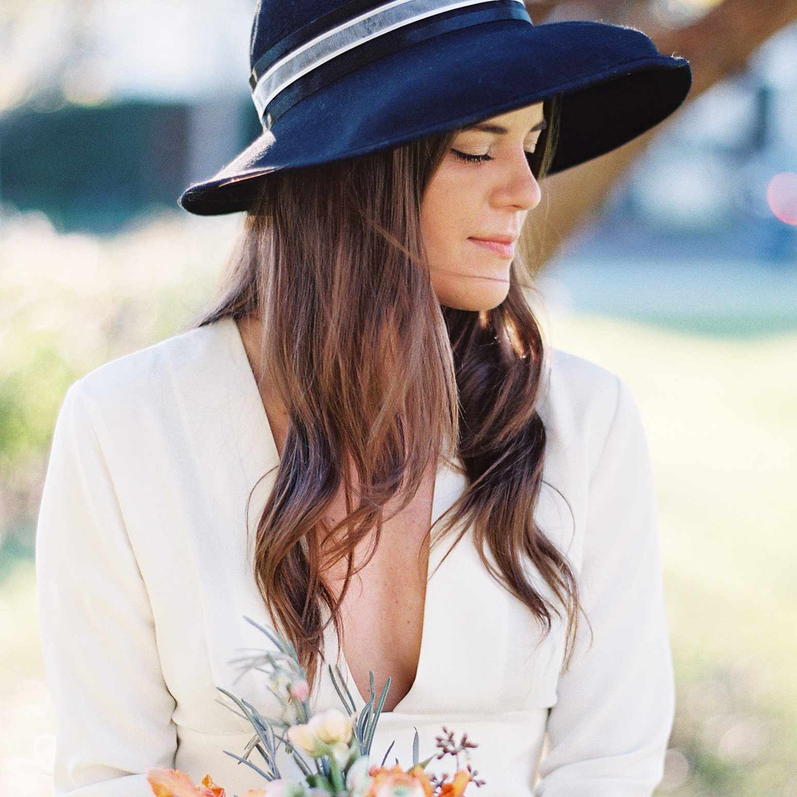 这个时尚的新娘不是传统的面纱,而是将她的天然妆容和头发与宽阔的头发搭配帽子。