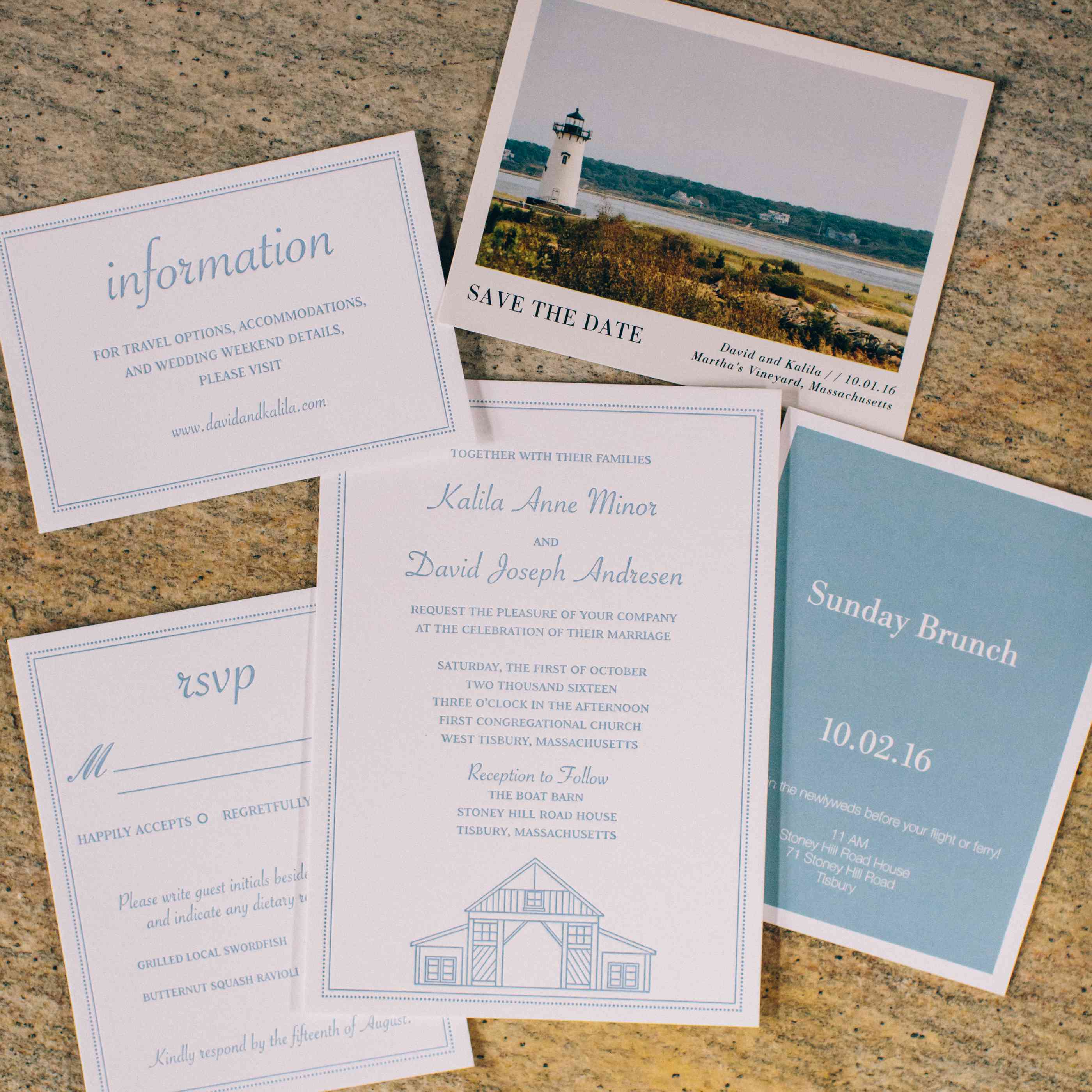 Vineyard-inspired蓝色面板,独一无二的邀请套房给客人什么期望从他们的岛的婚礼。