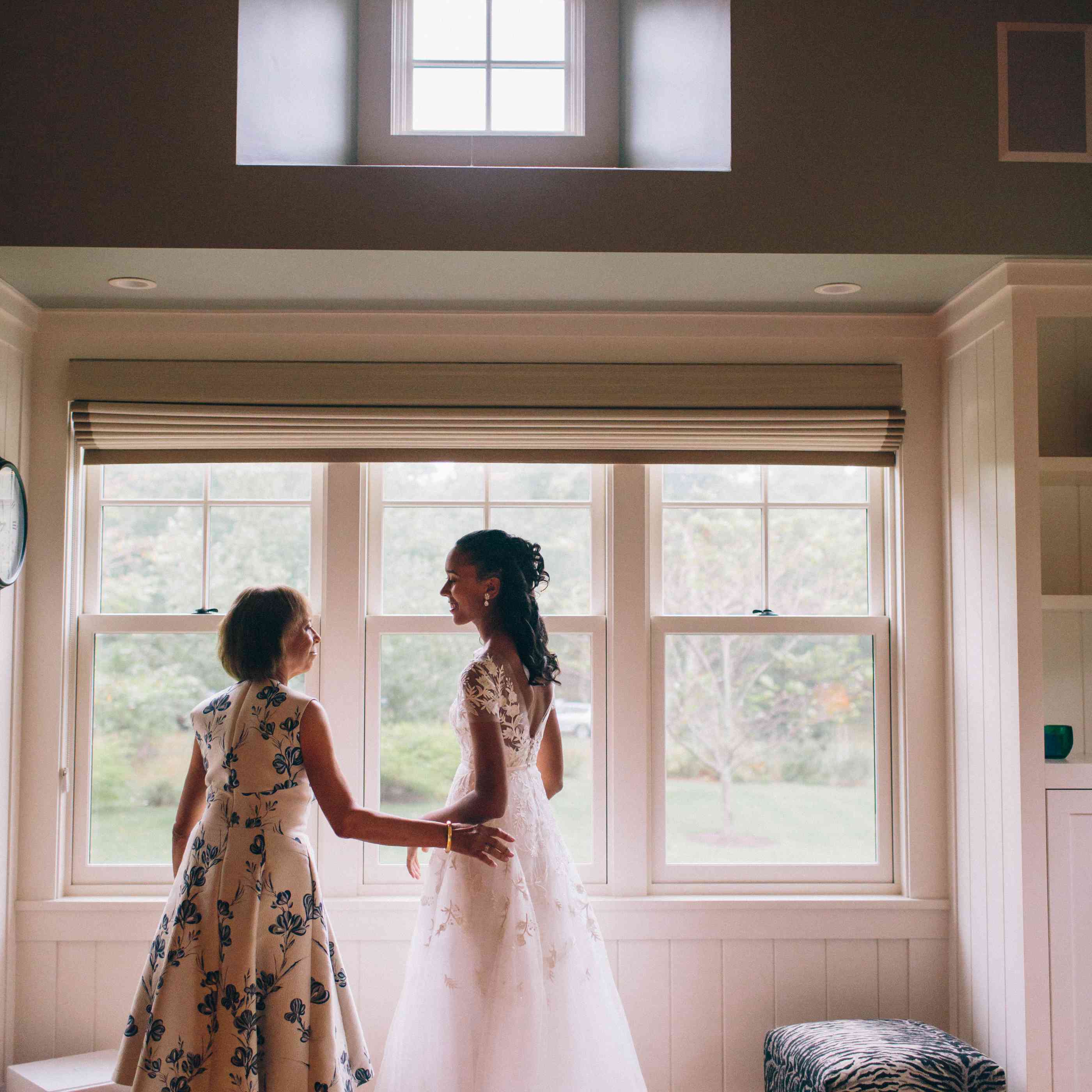 婚礼策划Kalila最喜欢的部分之一是服装购物和她的妈妈,姐姐,奶奶bet188体育手机端,和最好的朋友在纽约。马克英格拉姆在试穿服装工作室,准新娘发现她惊人的卡罗莱纳州Herrera礼服——a字形轮廓错觉领口和花贴花的细节。“我能想象这是多么完美的设置和季节,”她说。“叶子上面的细节很美,我很喜欢袖子。玛莎葡萄园岛可以寒冷的秋天。”