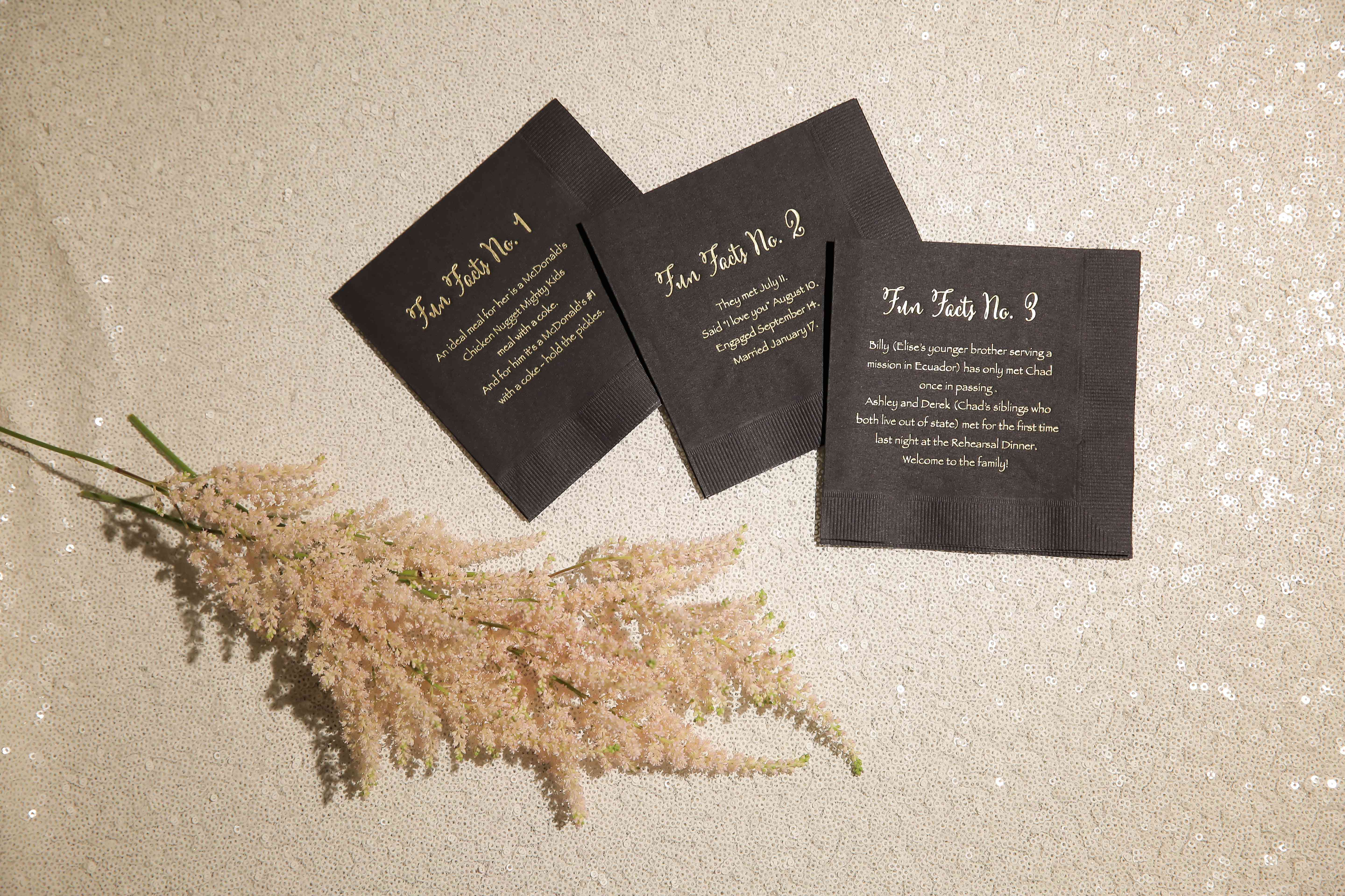 在你的餐桌装饰或令人惊讶的娱乐乐趣的细节可以得到客人们谈话。“对于一个婚礼在新娘和新郎的双方都没有真正了解对方,我们设计的自定义‘有趣的事实’鸡尾酒餐巾纸,说:”米歇尔利奥活动的米歇尔 - 考辛斯。“有三种不同风格的餐巾纸,每一个包括大约新娘和新郎一个有趣的事实,他们的启发嘉宾进行互动和分享的故事。”现场娱乐表演或音乐,如钢鼓的玩家,桑巴舞蹈家,或流浪乐队,也可以是很好的破冰船,让局外人了舞池和社交与其他客人。