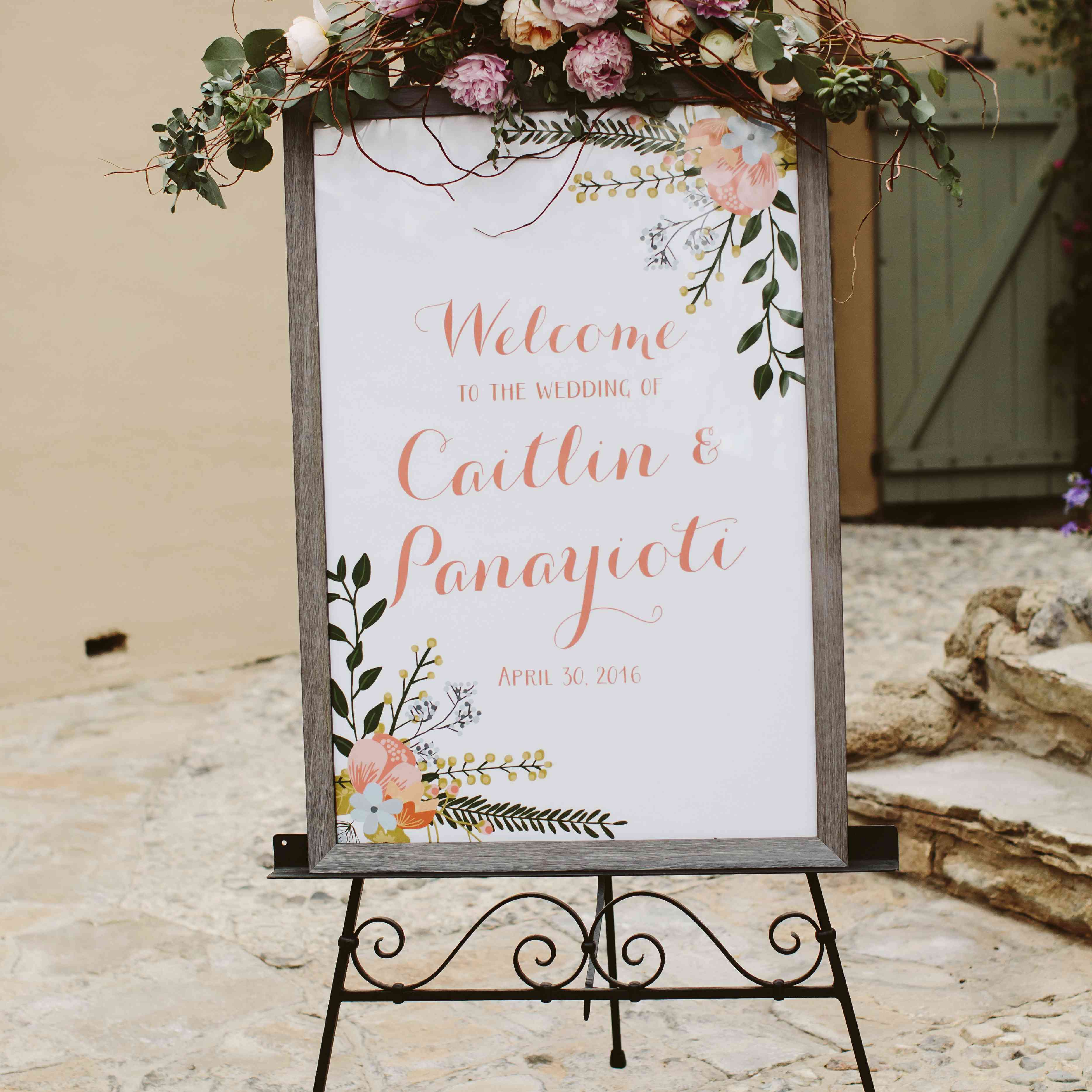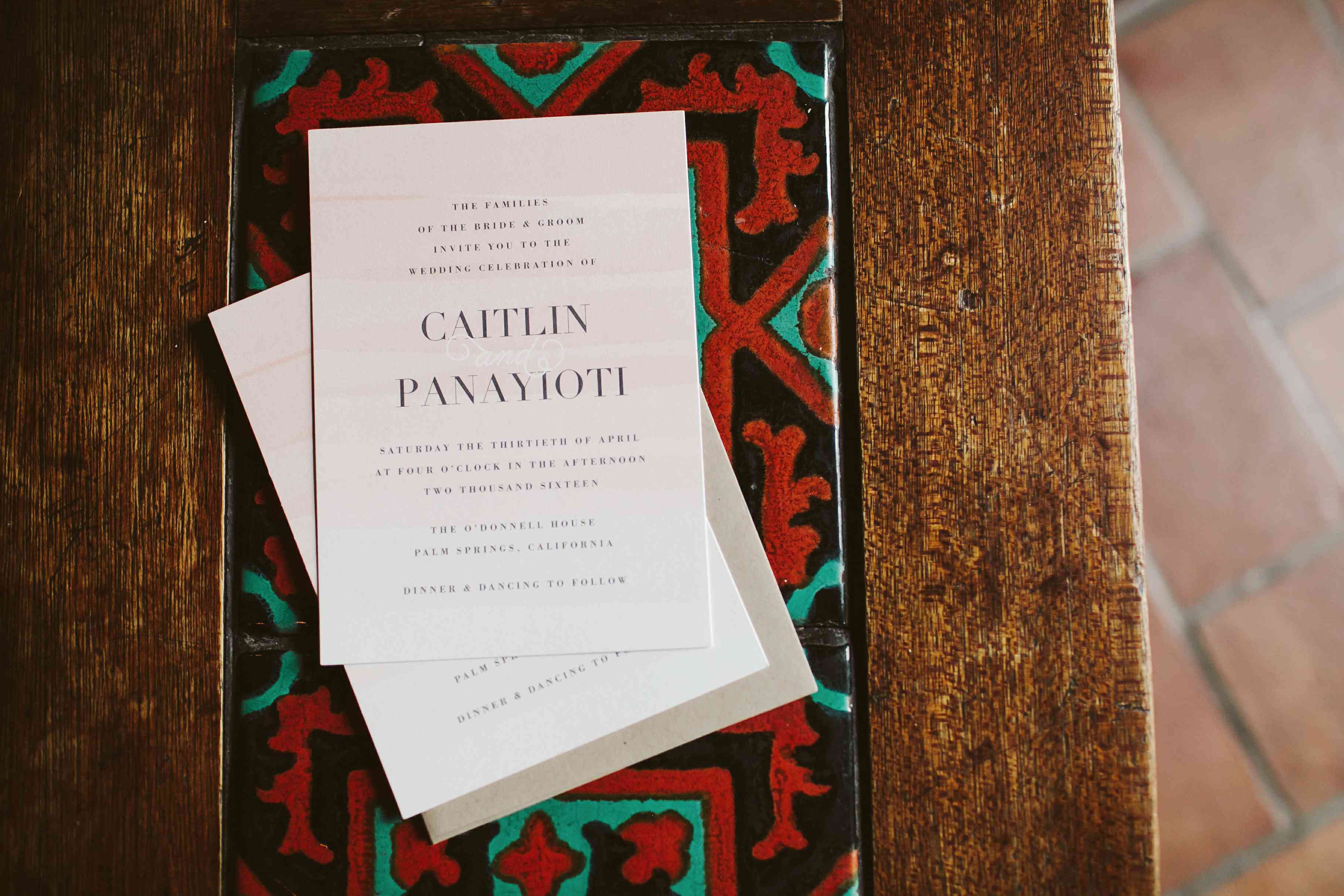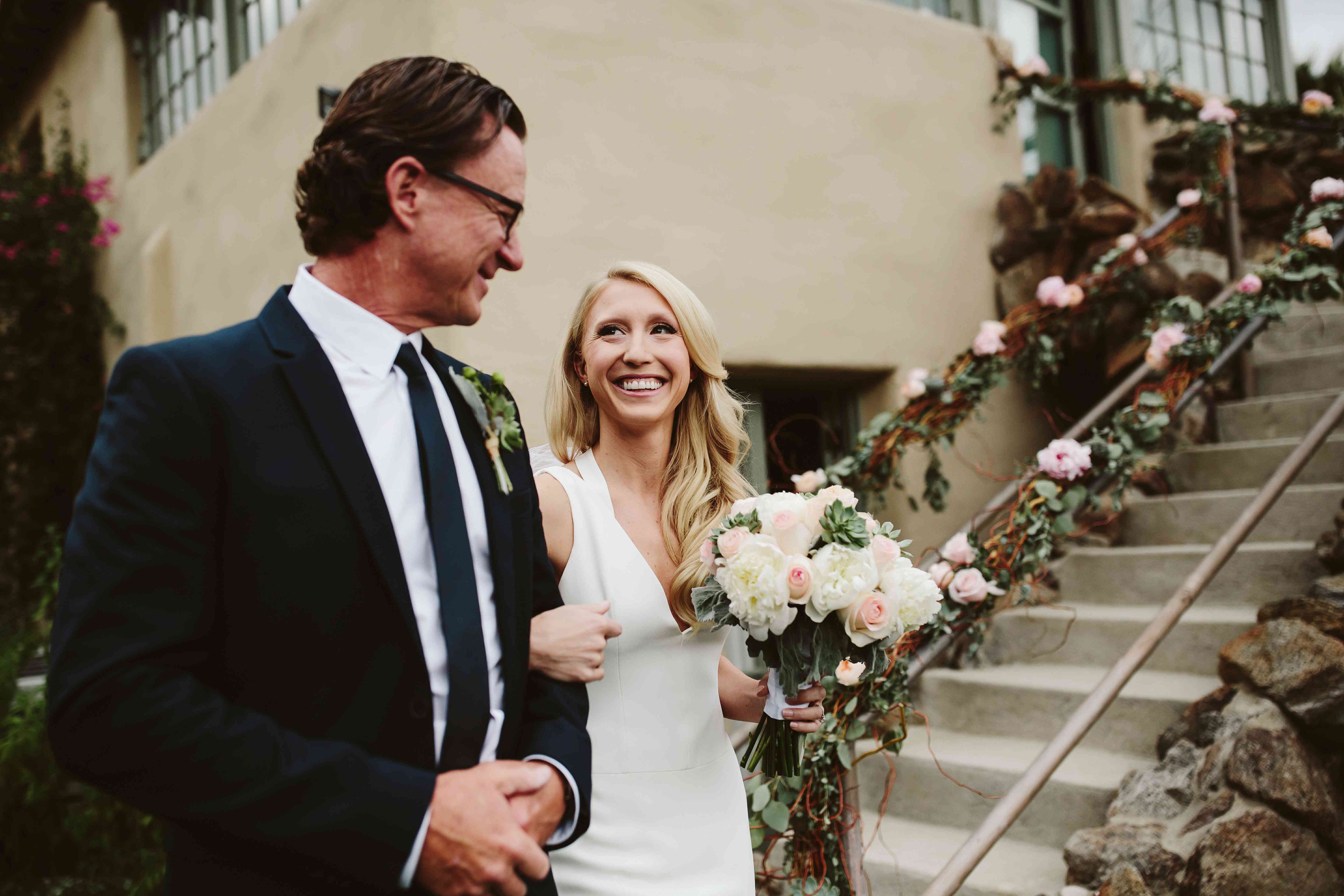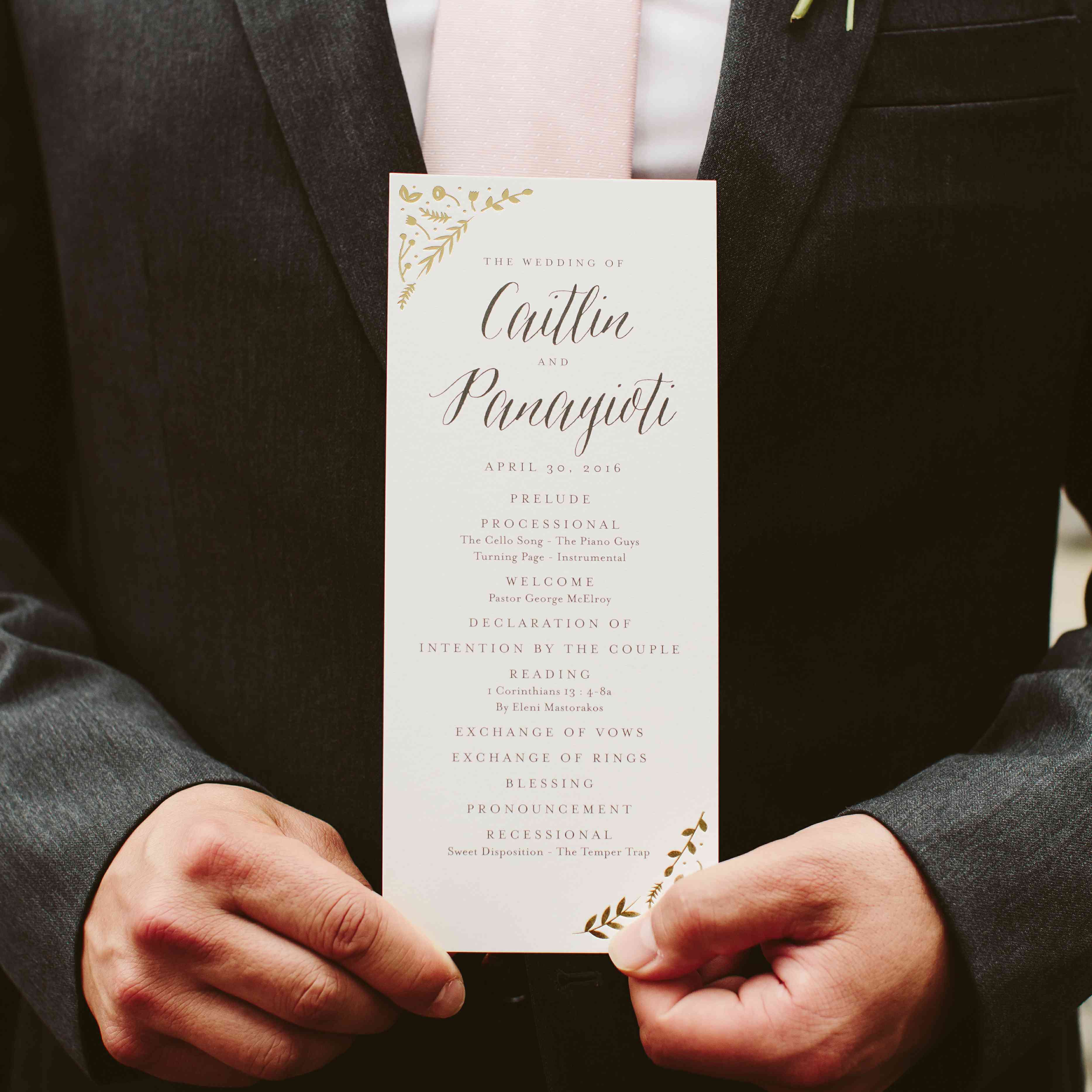 凯特琳的父亲陪着她走过红毯,然后她的父母把她交给了帕纳约蒂。“为我们主持婚礼的牧师是我父母一生的朋友——他是在他们结婚那天为他们主持婚礼的人!”新娘说。她和帕纳约蒂自己写了誓词,选择了一个字数限制和一个“我发誓”的主题将誓词联系在一起。凯特琳回忆说:“我们用第一首舞曲的副歌的歌词来结束我们的誓言。”