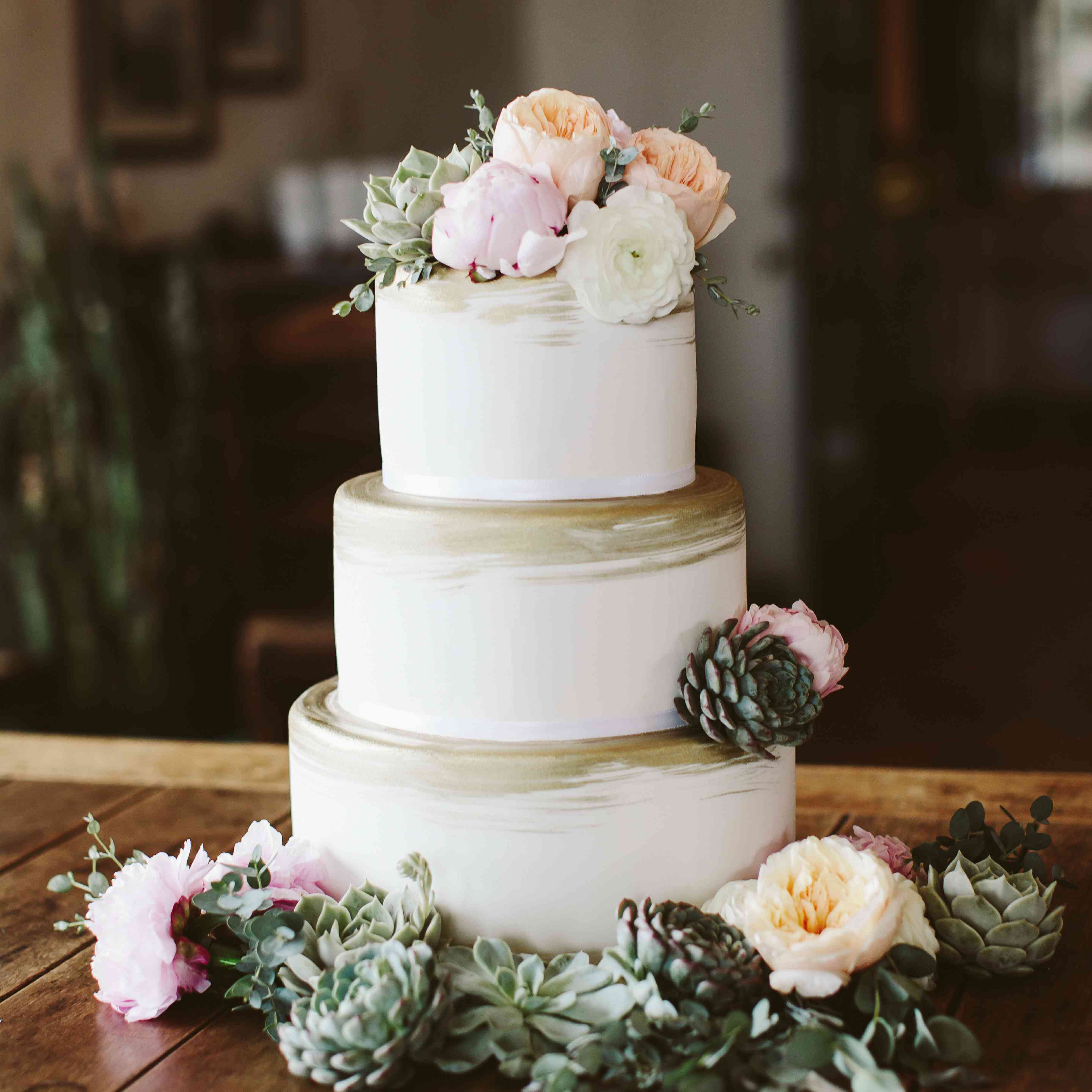 帕纳约奥蒂和凯特琳的三层婚礼蛋糕棒极了。白色的软糖刷上了金色,蛋糕上点缀着牡丹、金凤花和多肉植物。多层香草黄油磅蛋糕充满了草莓和香草慕斯。