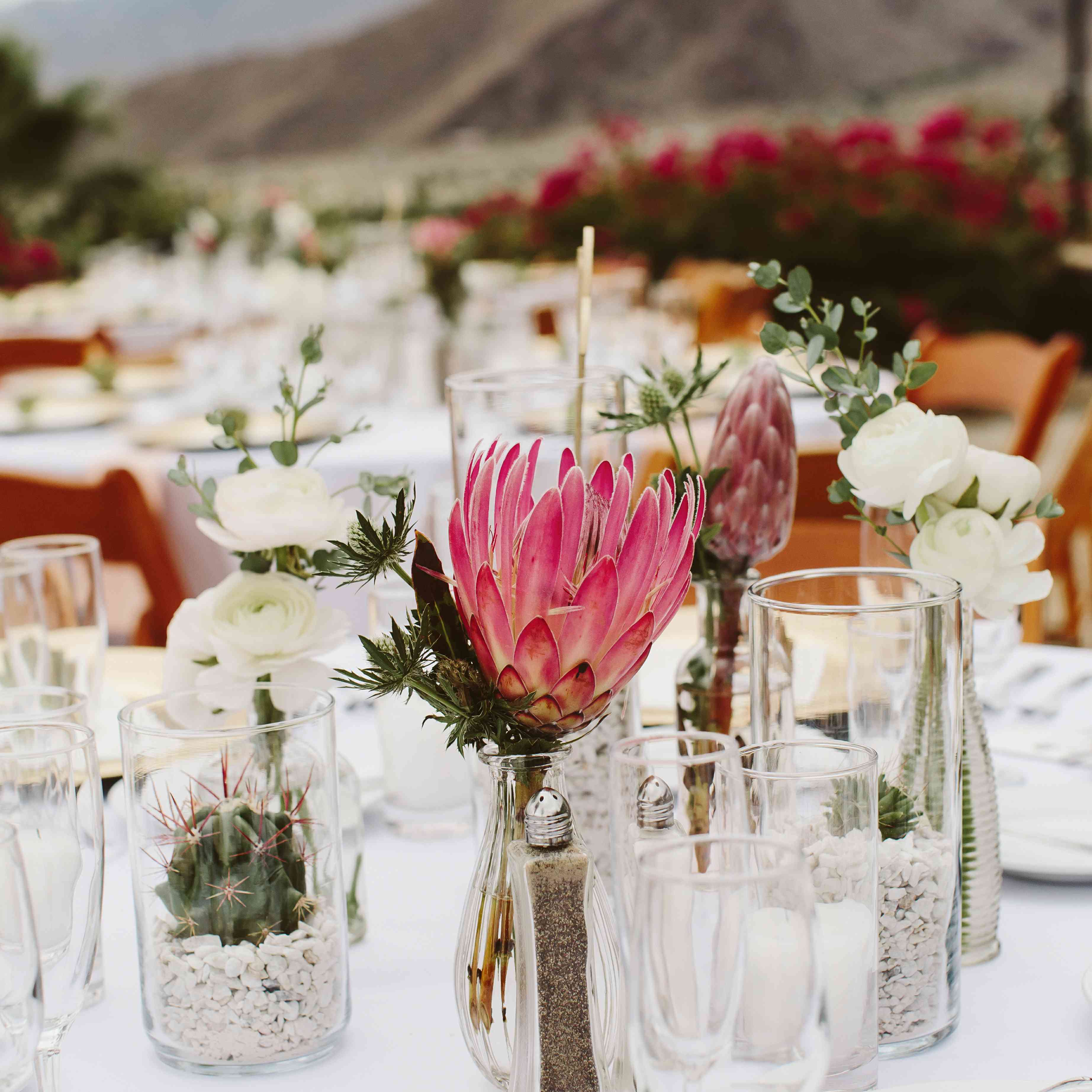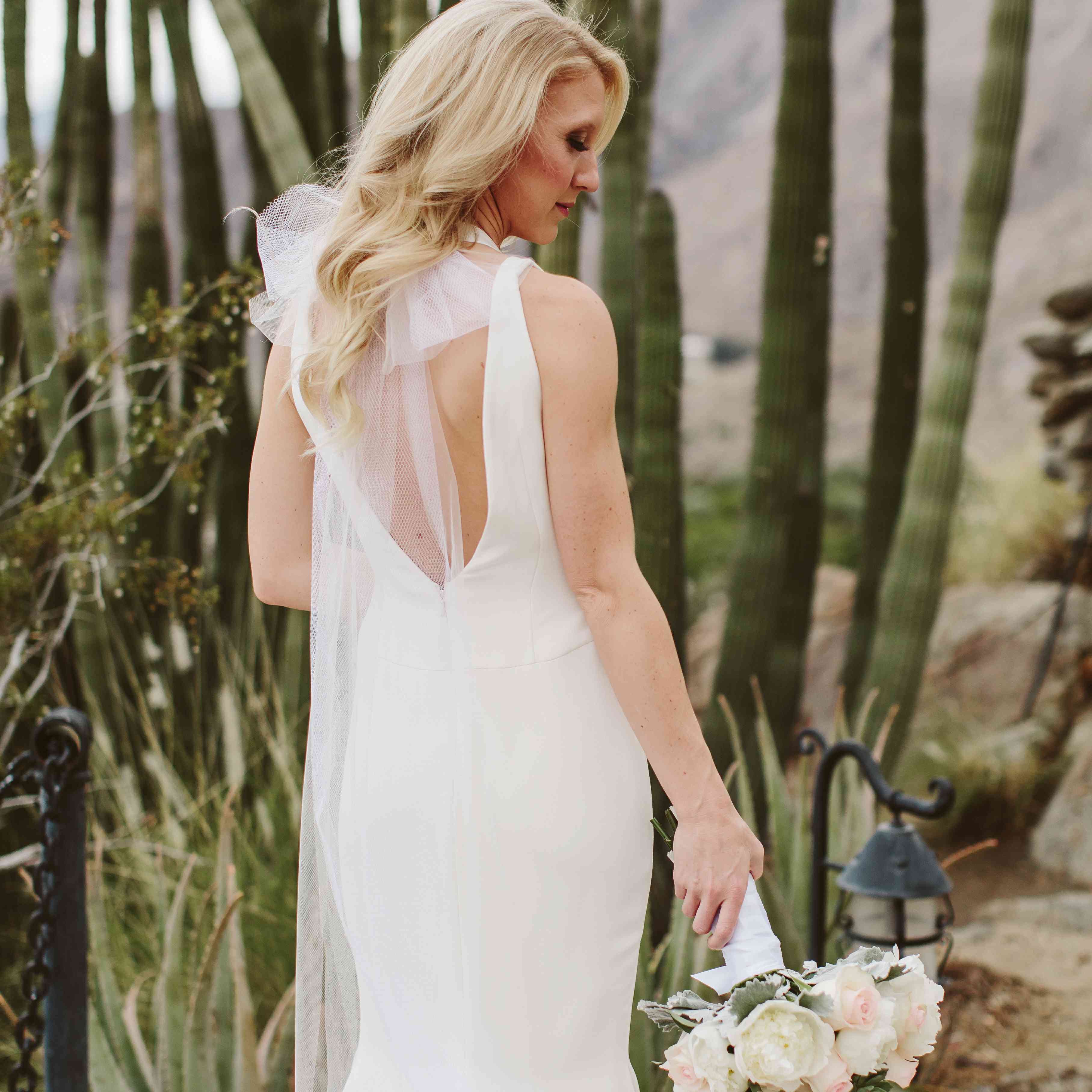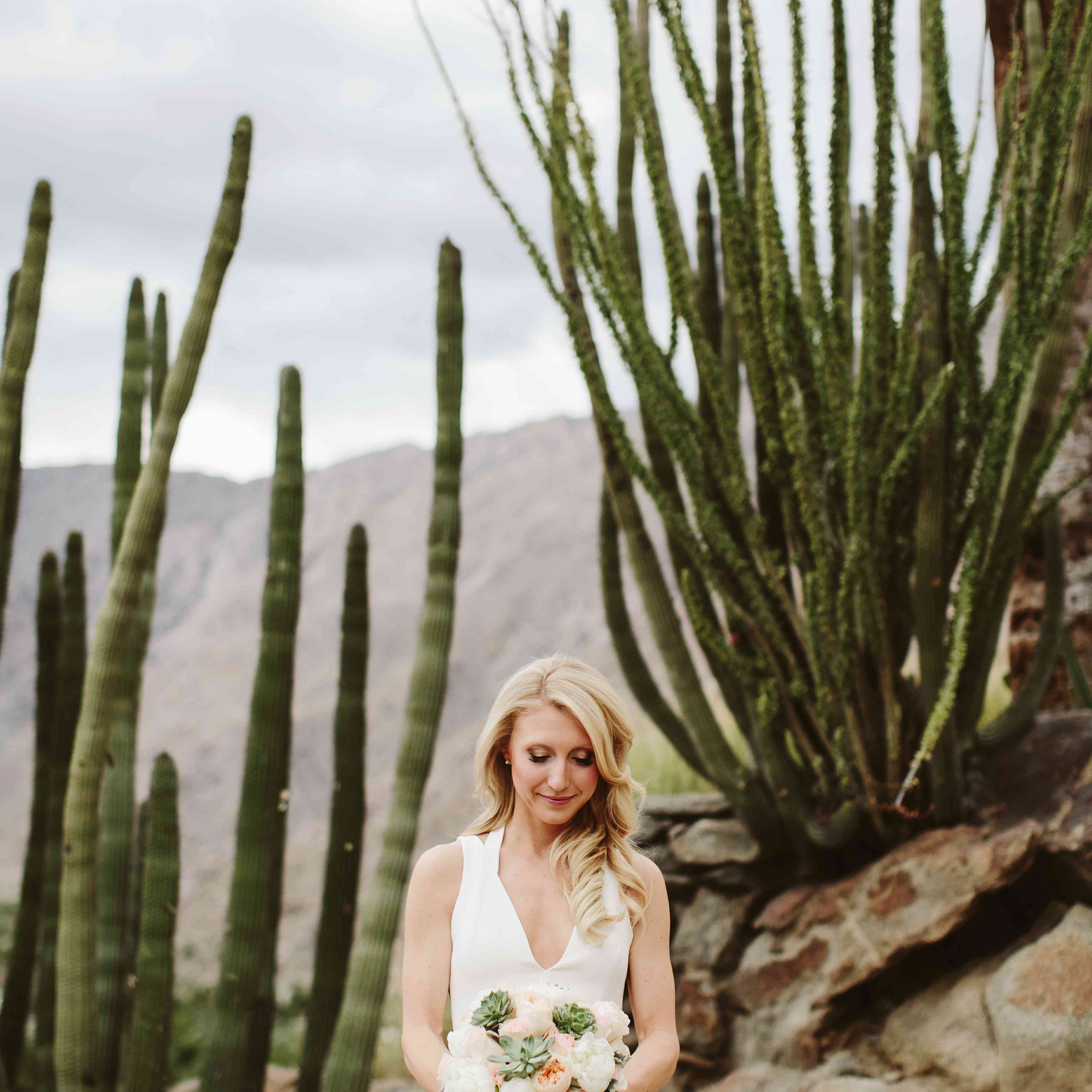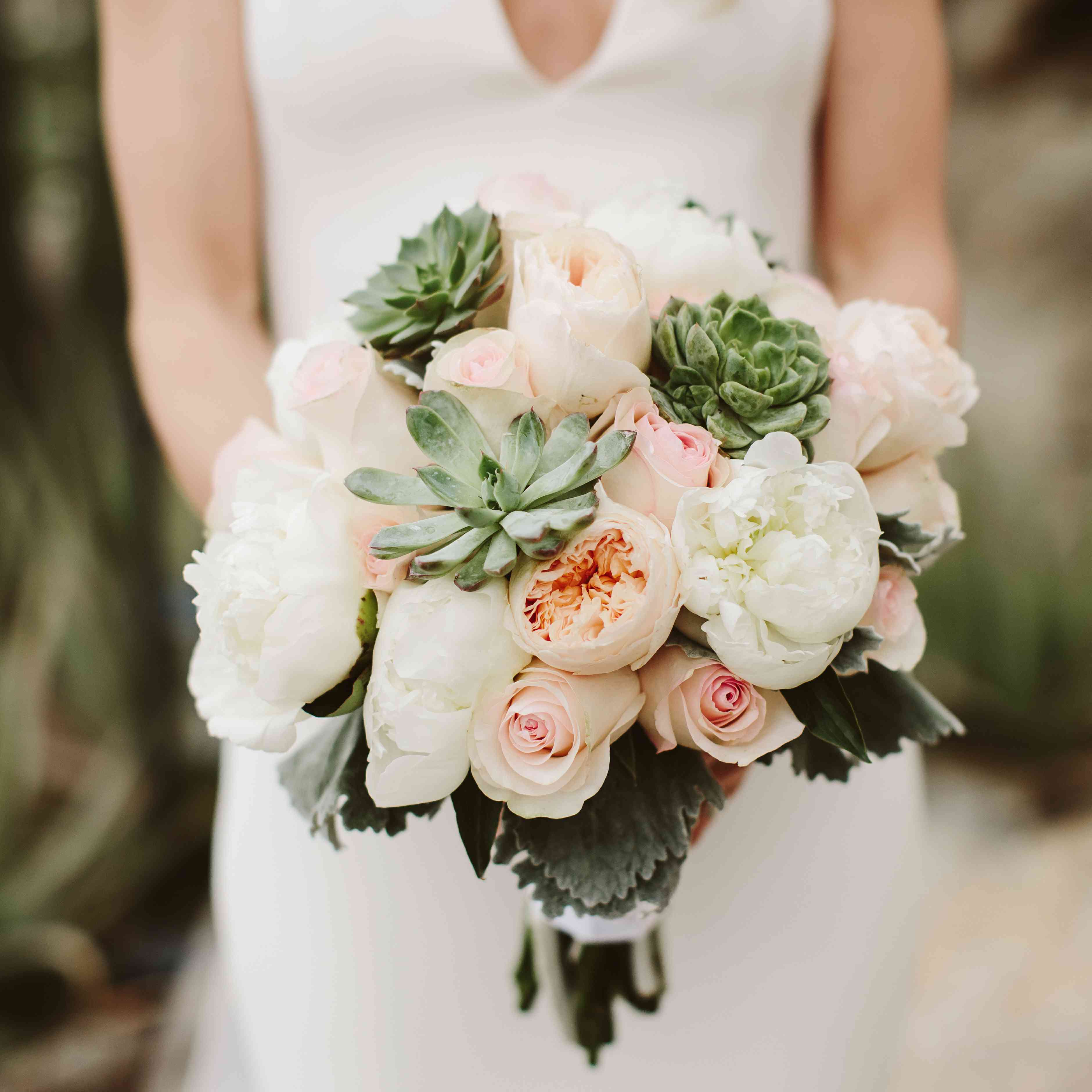 凯特琳的花束充满了沙漠的灵感,白色的牡丹和桃红色的玫瑰点缀着雕塑般的多肉植物。