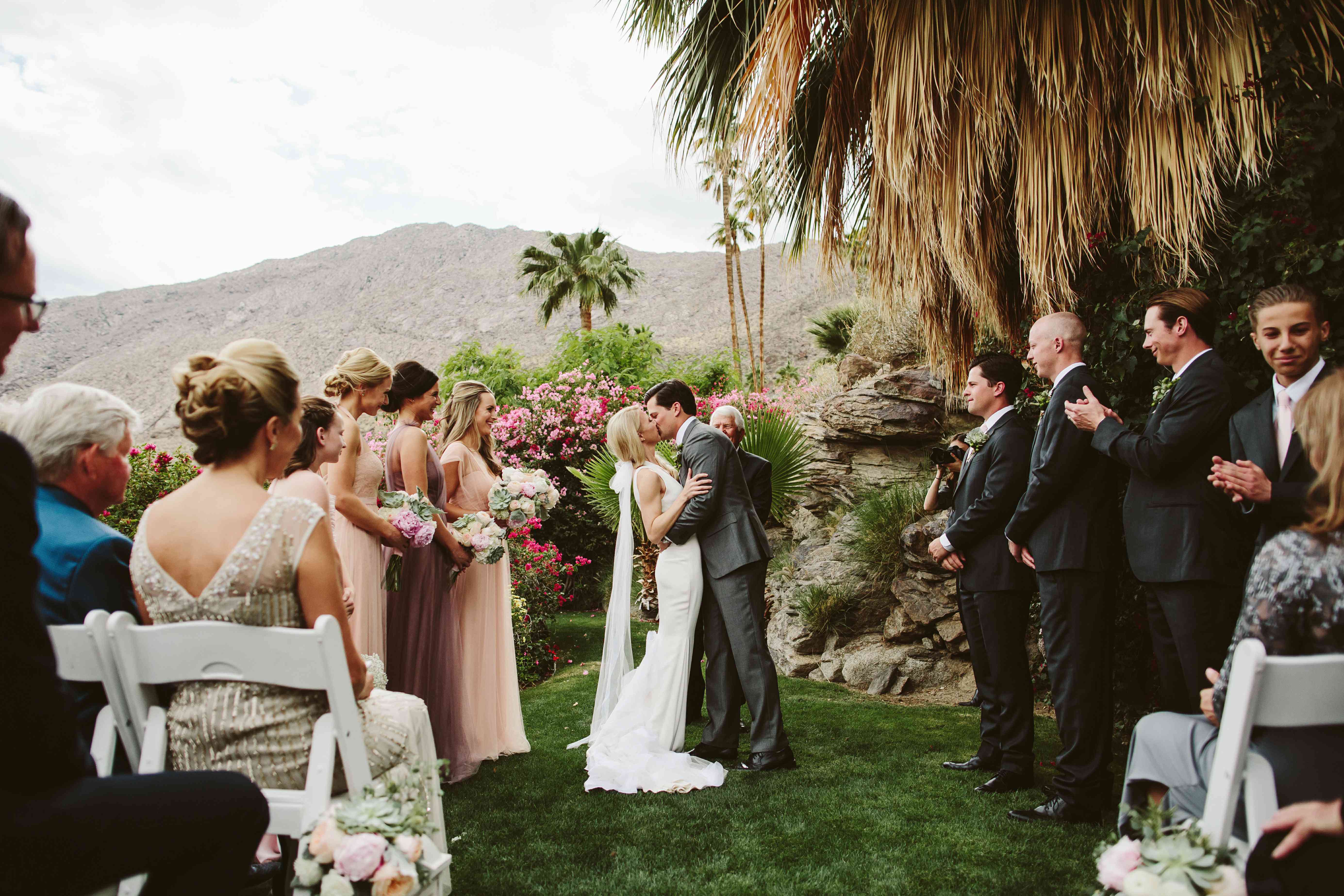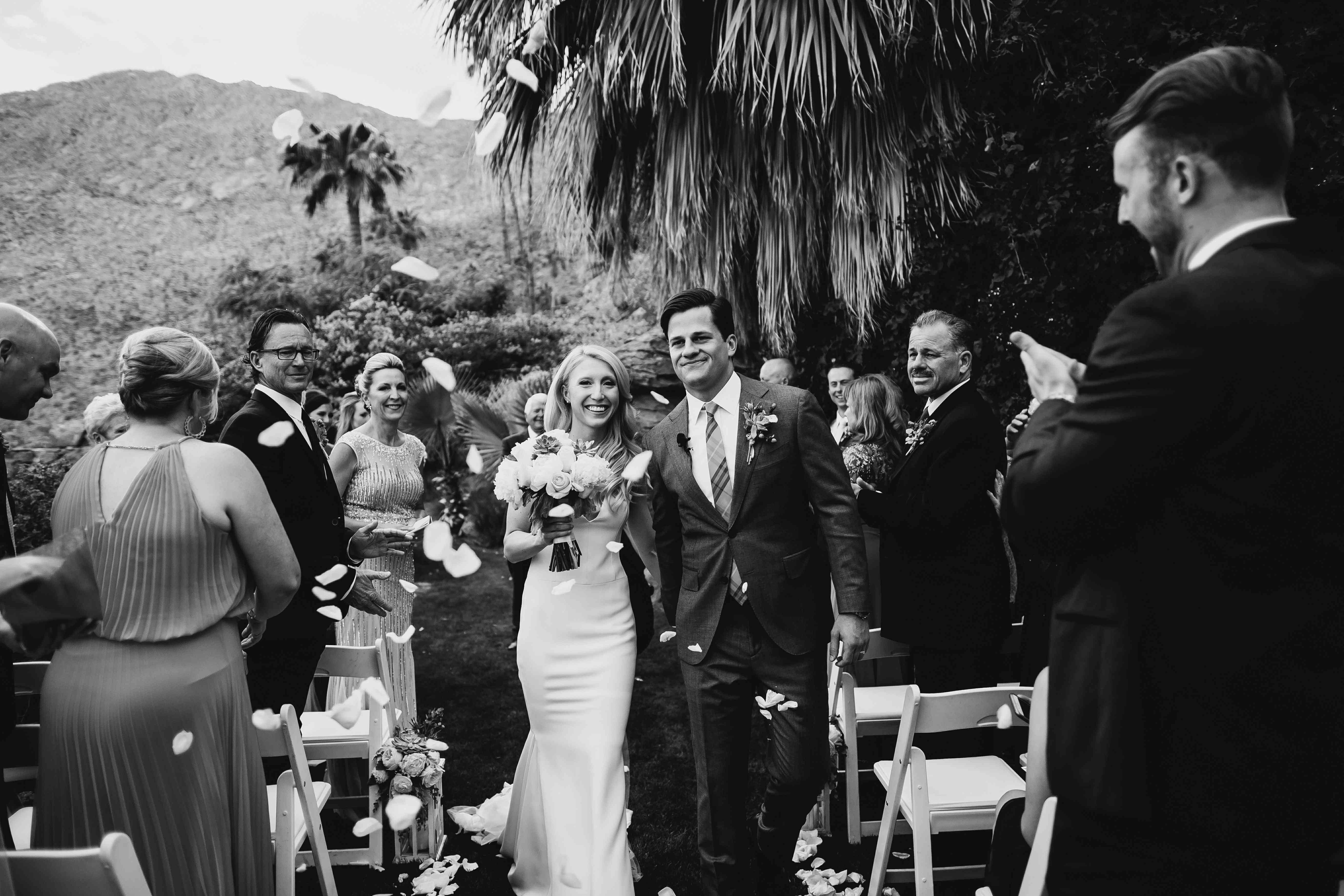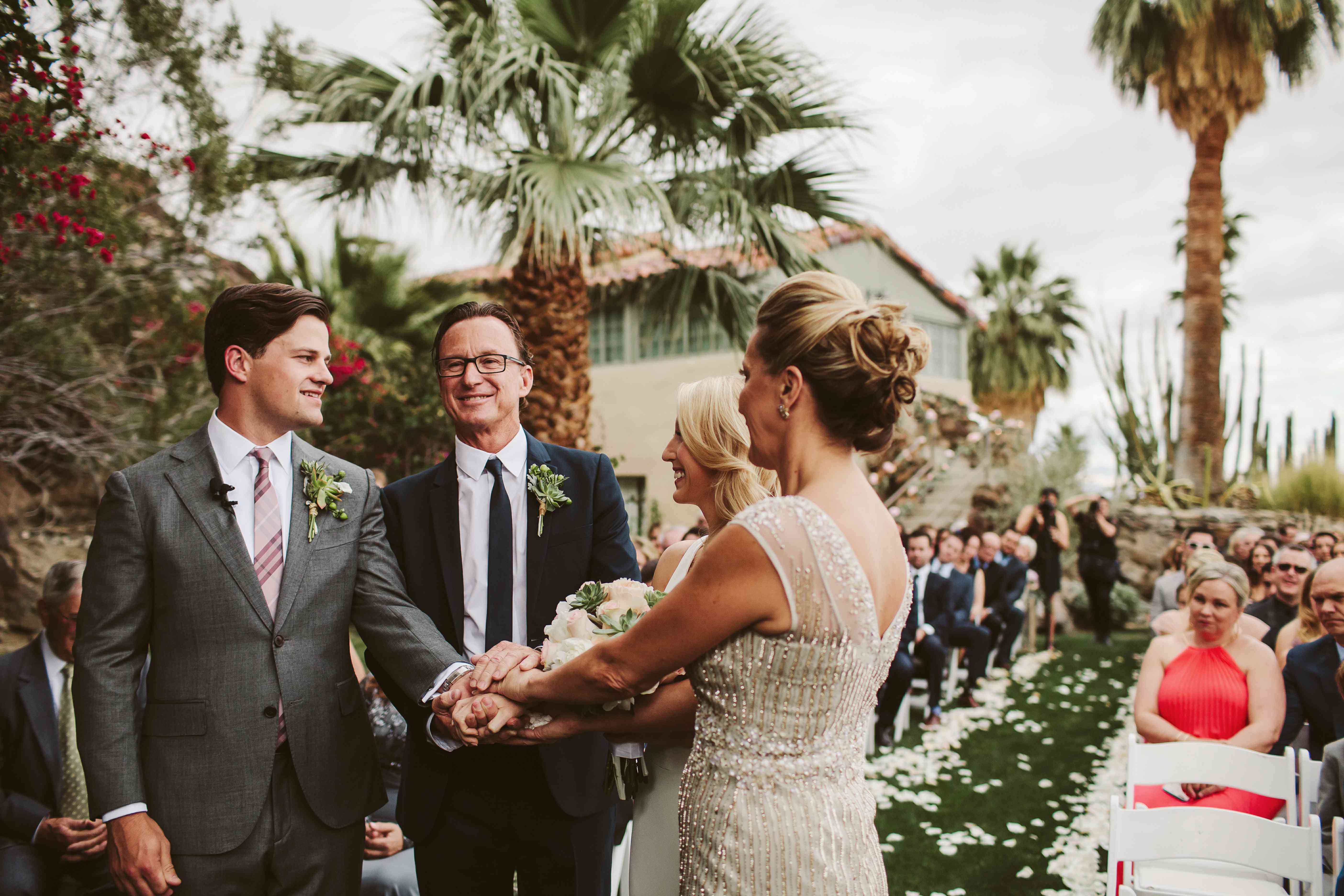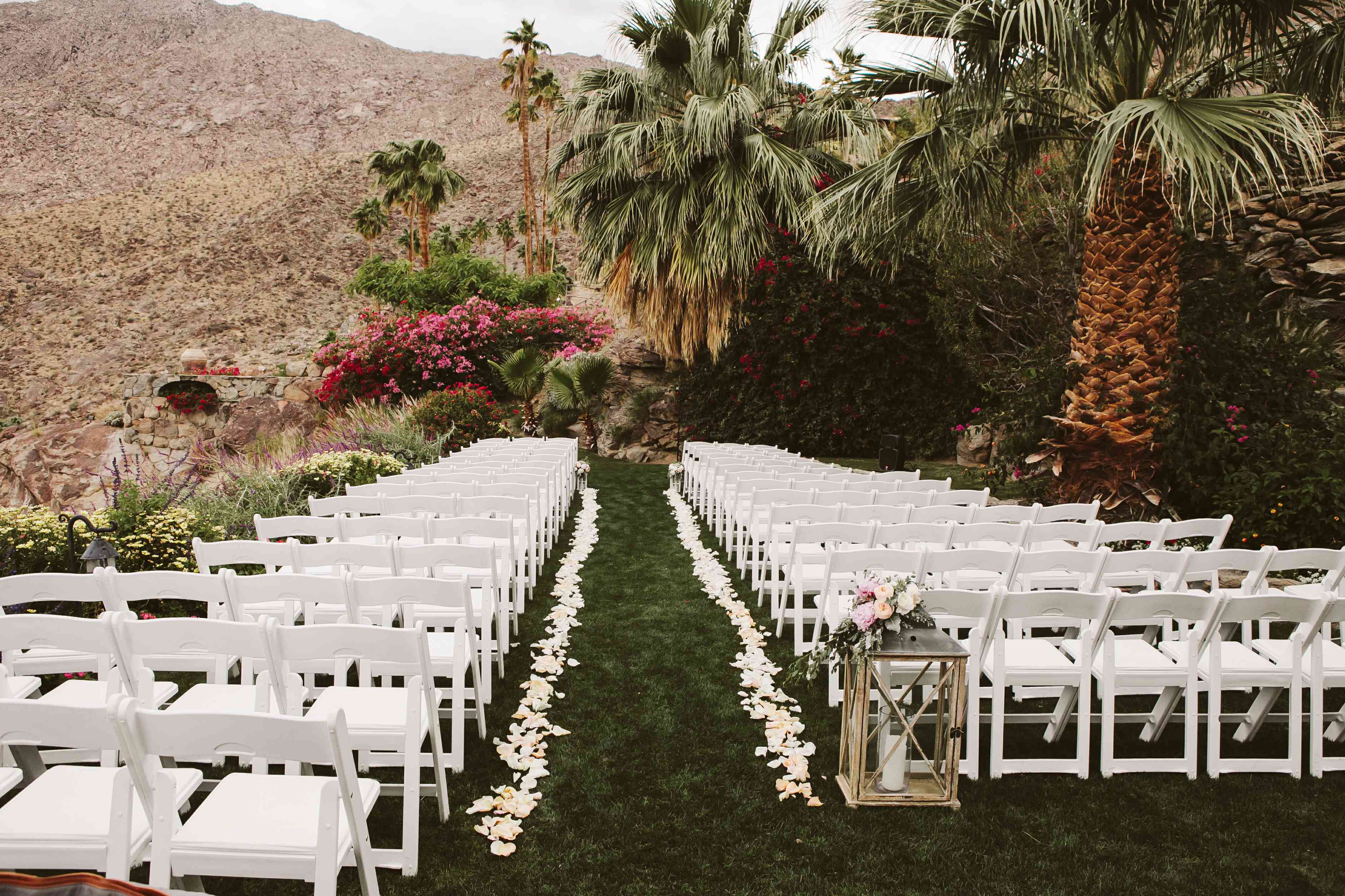 这对新人的婚礼在这处房产的草坪上举行,一条花瓣铺成的走廊两侧摆放着白色的椅子,背景是当地的棕榈树和仙人掌。