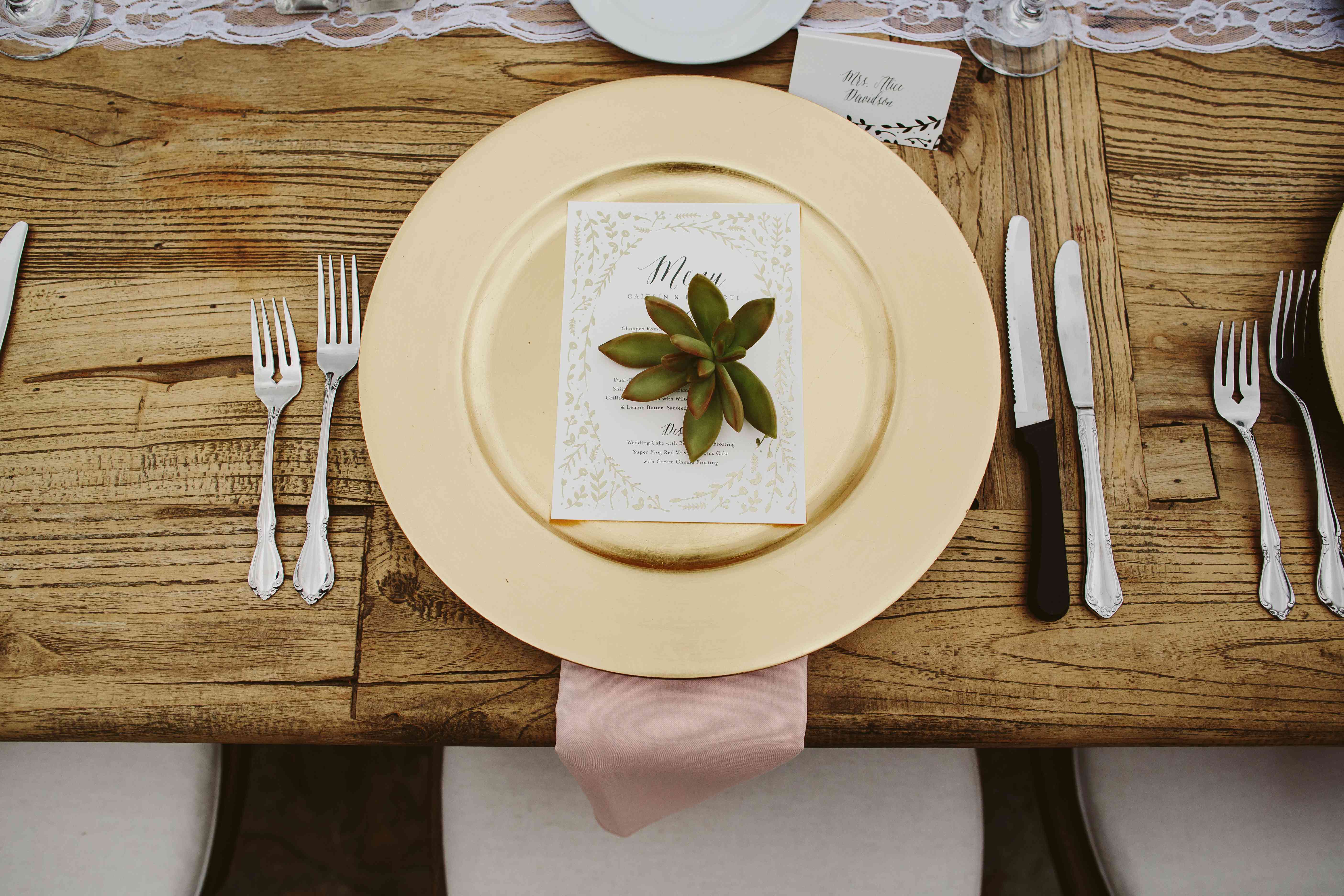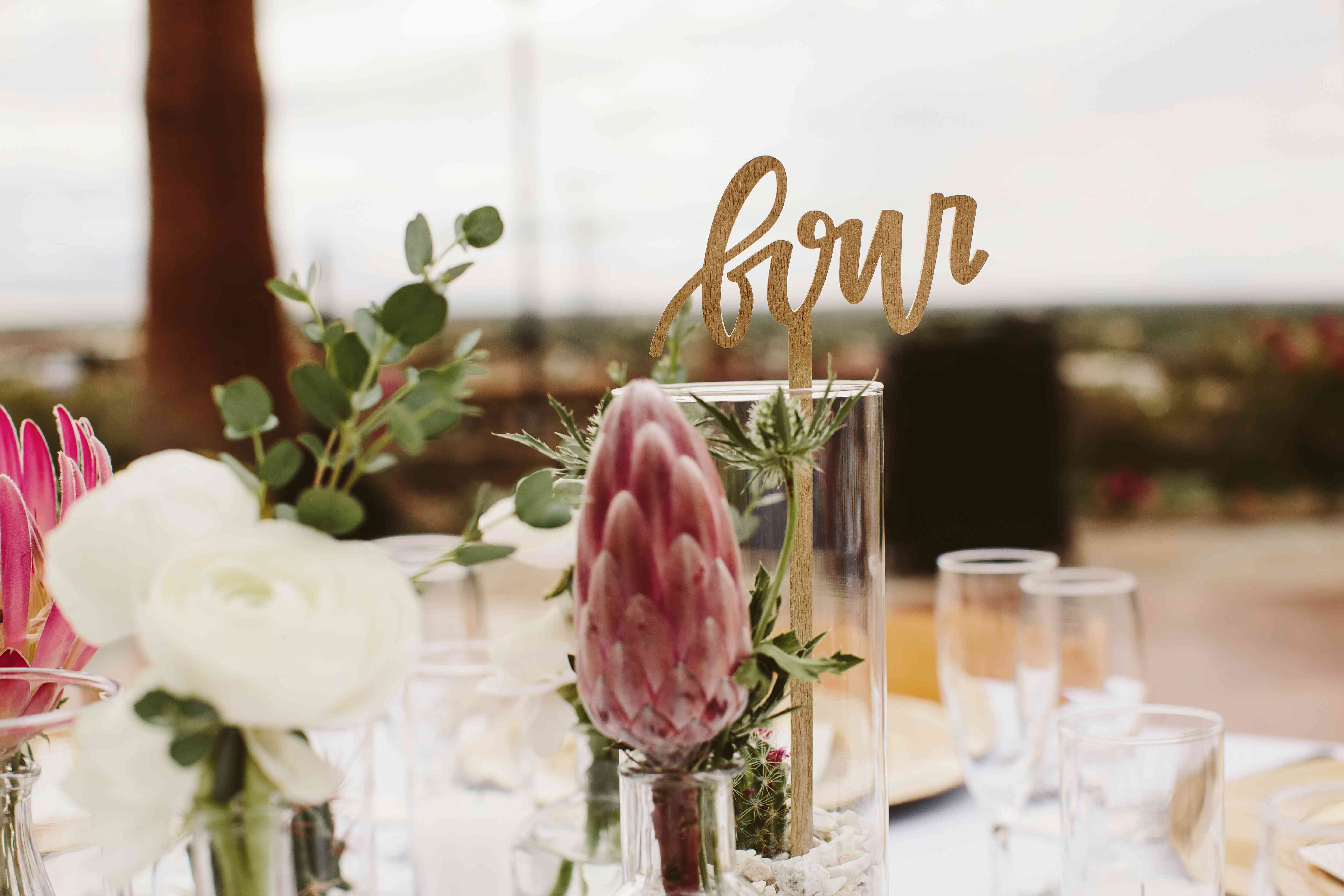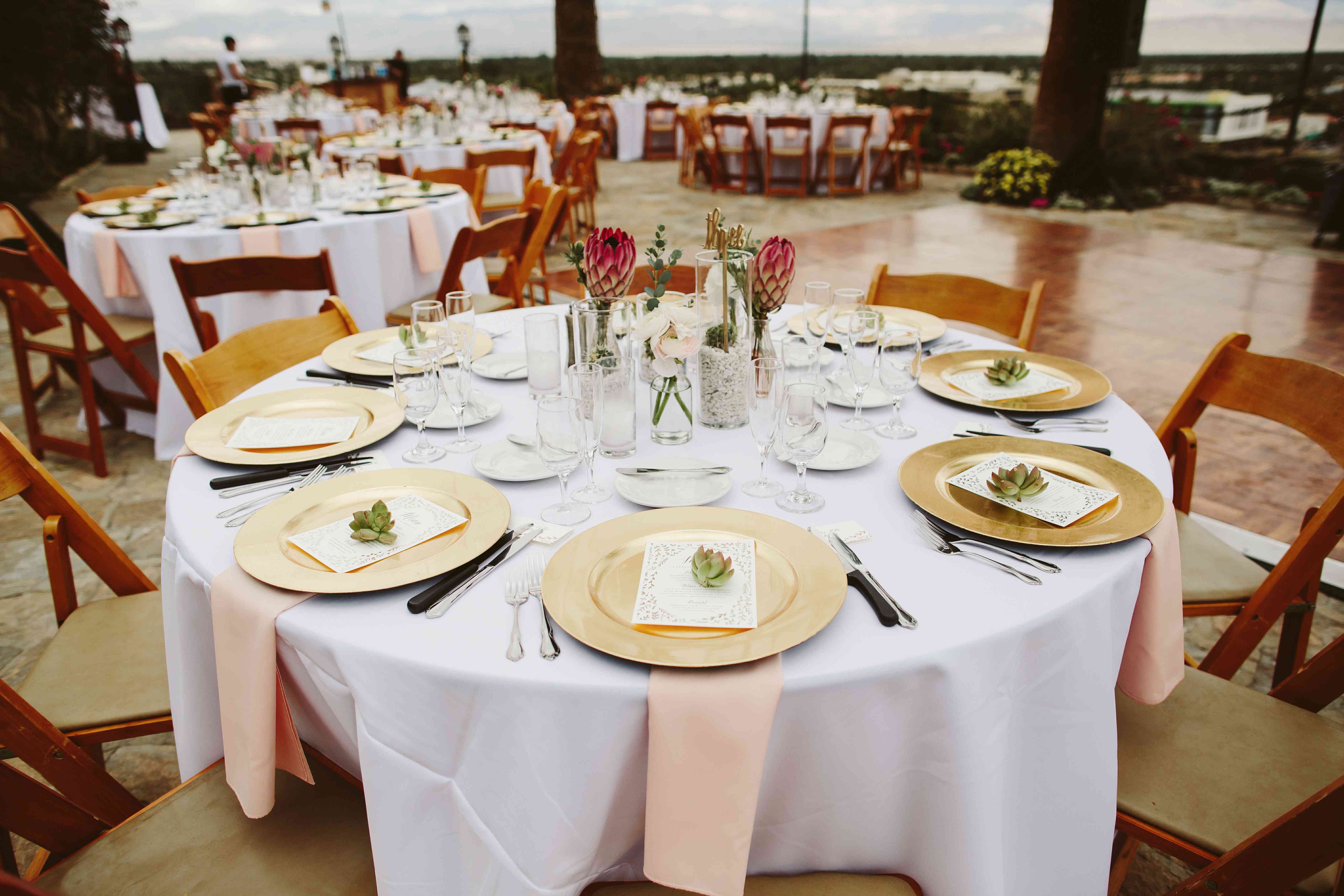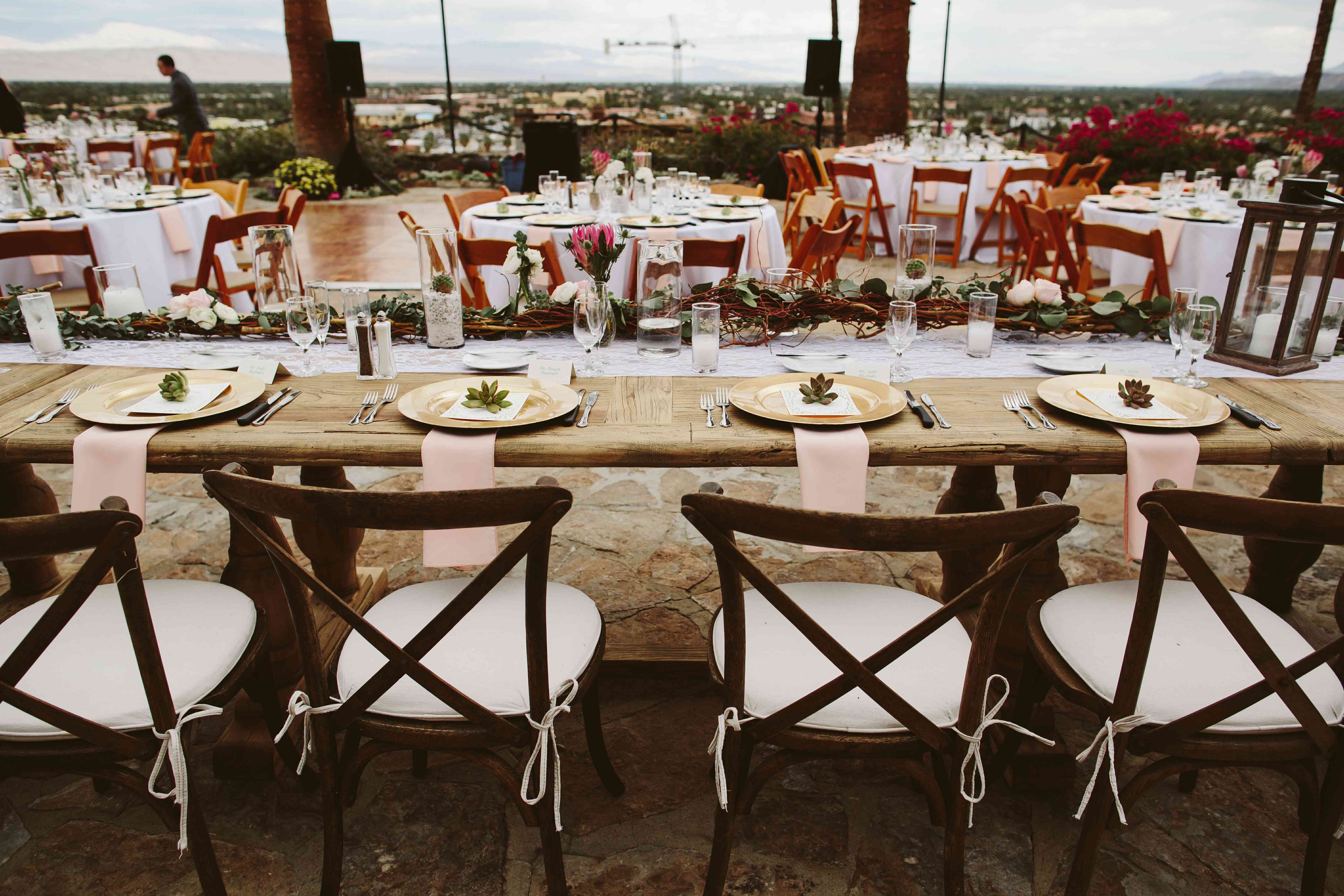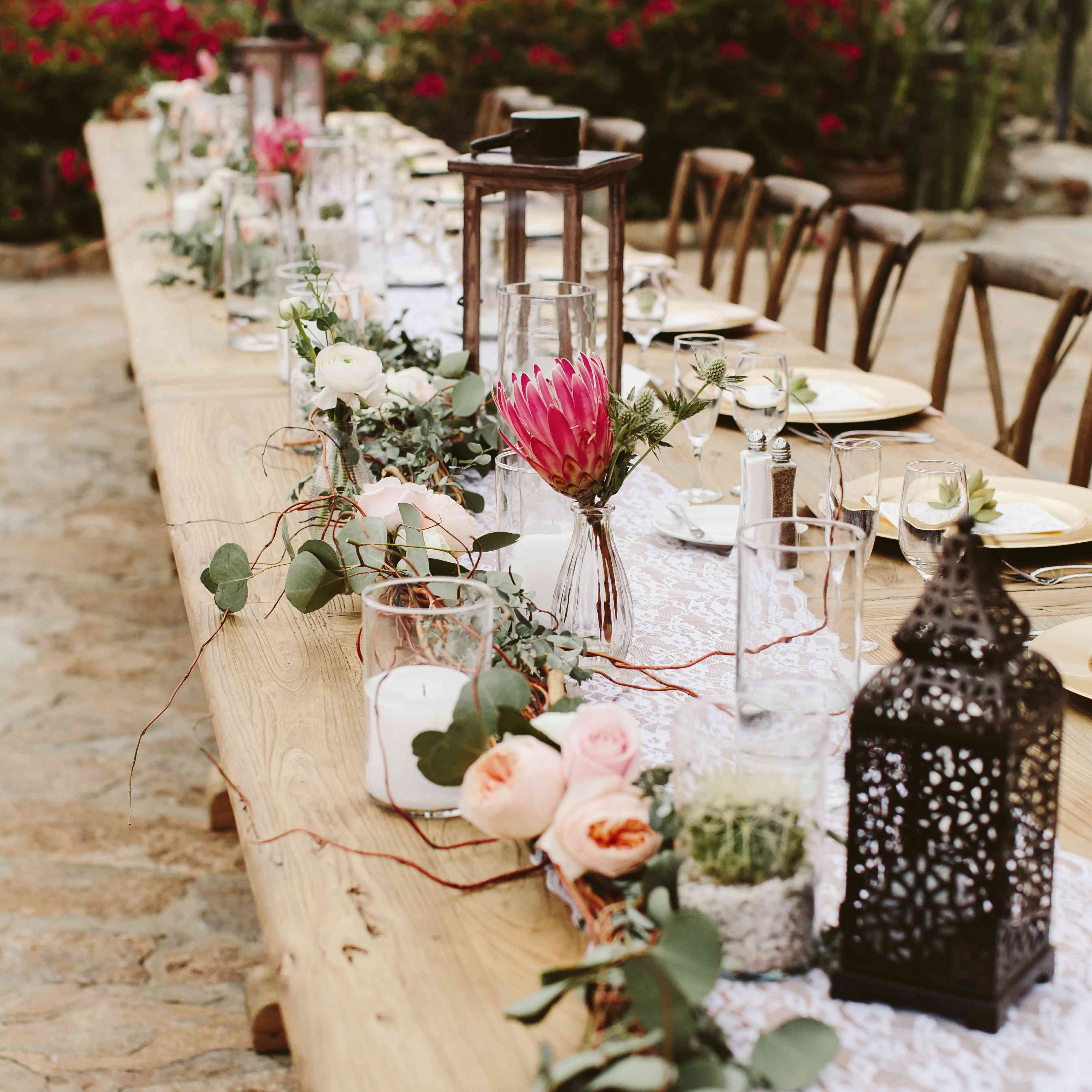 婚礼宴会在一张光秃秃的桌子上举行,上面点着灯笼,上面挂着蕾丝花边和婚礼楼梯上用的花环——这是一种控制花的开销的完美方式!