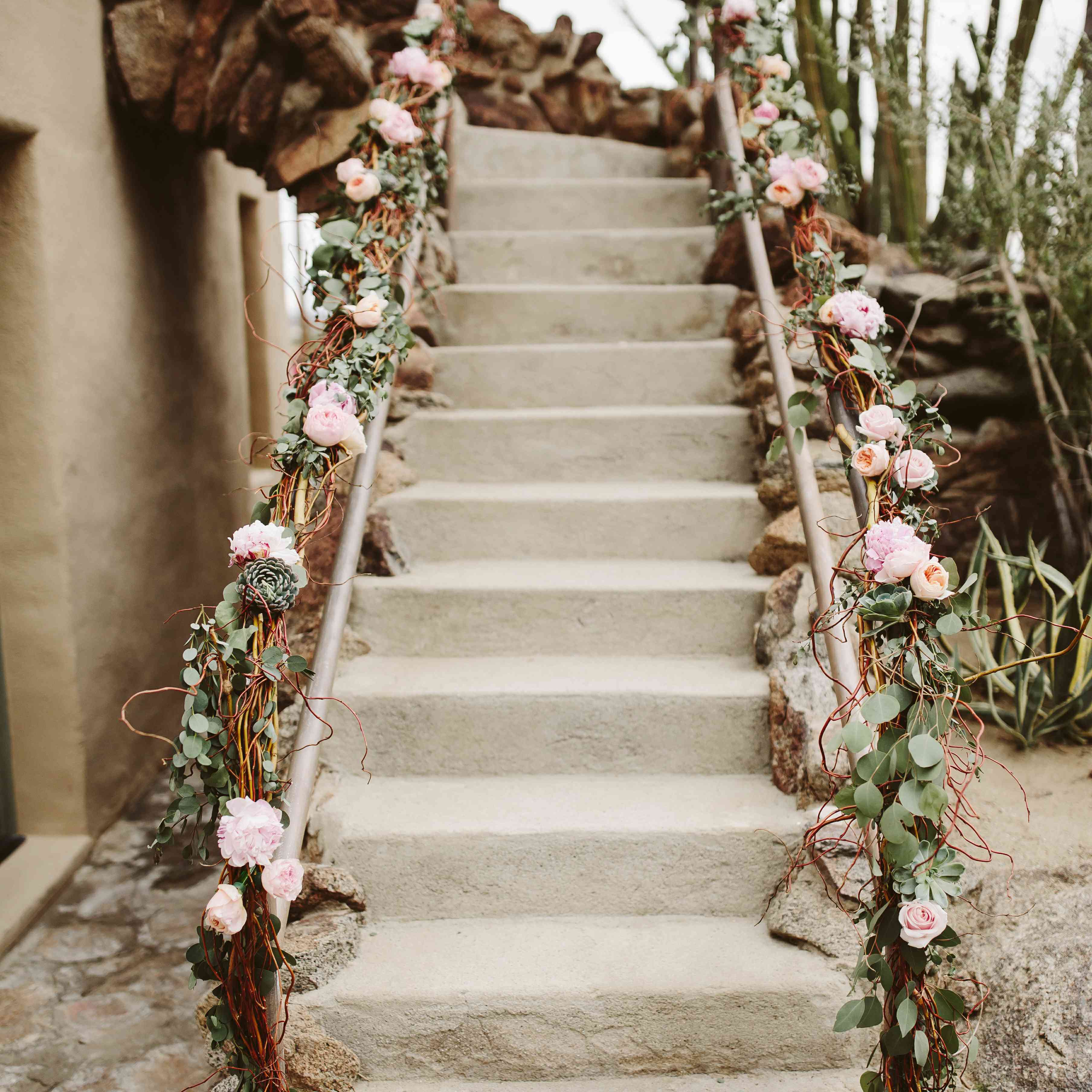 凯特琳在通往婚礼的楼梯上,也就是她华丽的入场处,装饰着卷曲的柳树、桉树、柔软的粉红色牡丹、金凤花和多肉植物。在通道的入口,两个超大的灯笼顶部装饰着牡丹和玫瑰。