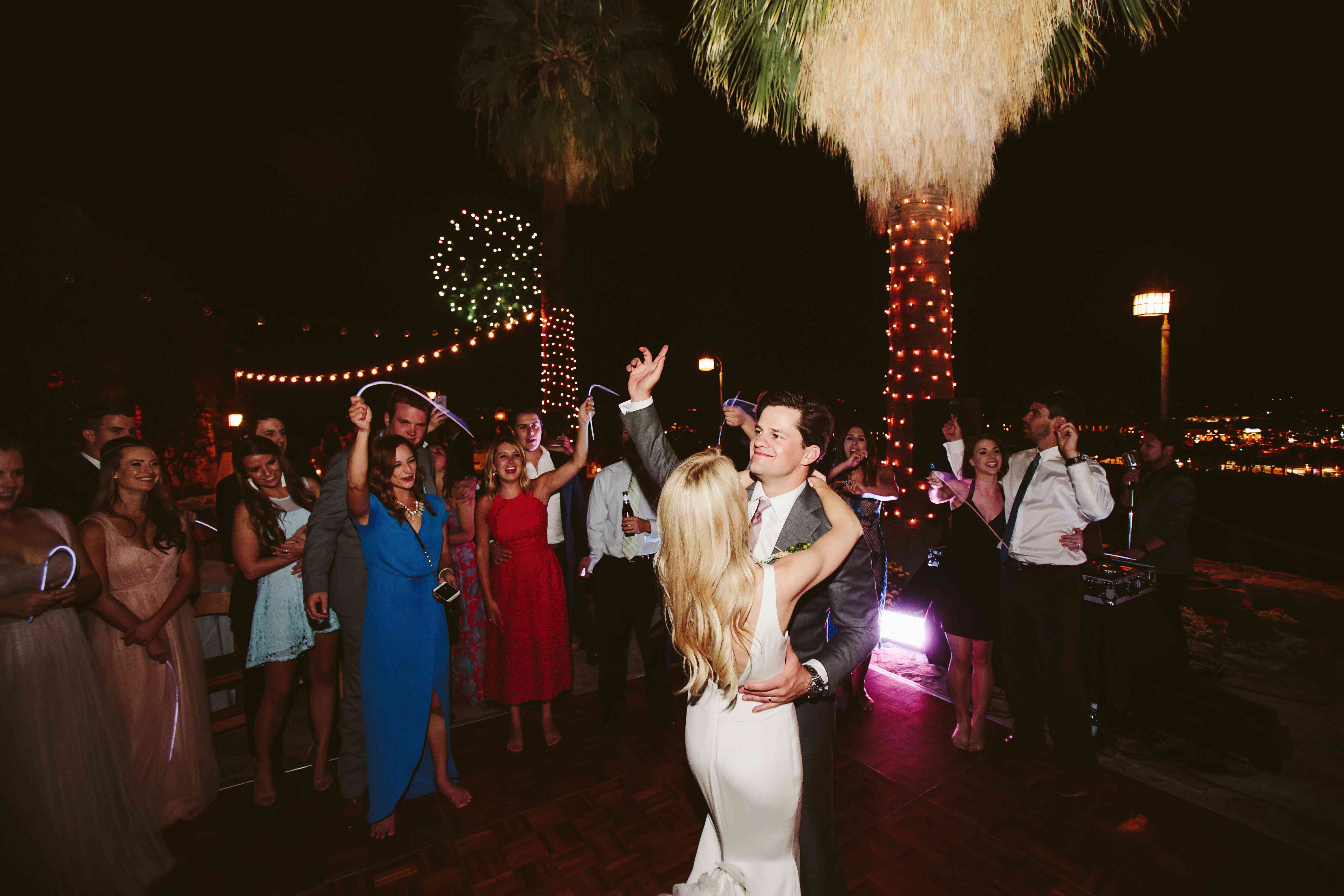 户外招待会在奥唐纳住宅的露台上举行,可以俯瞰棕榈泉的所有景色。客人们坐在圆桌旁,桌上摆满了绿蓟、凤仙花、金凤花和蜡烛。