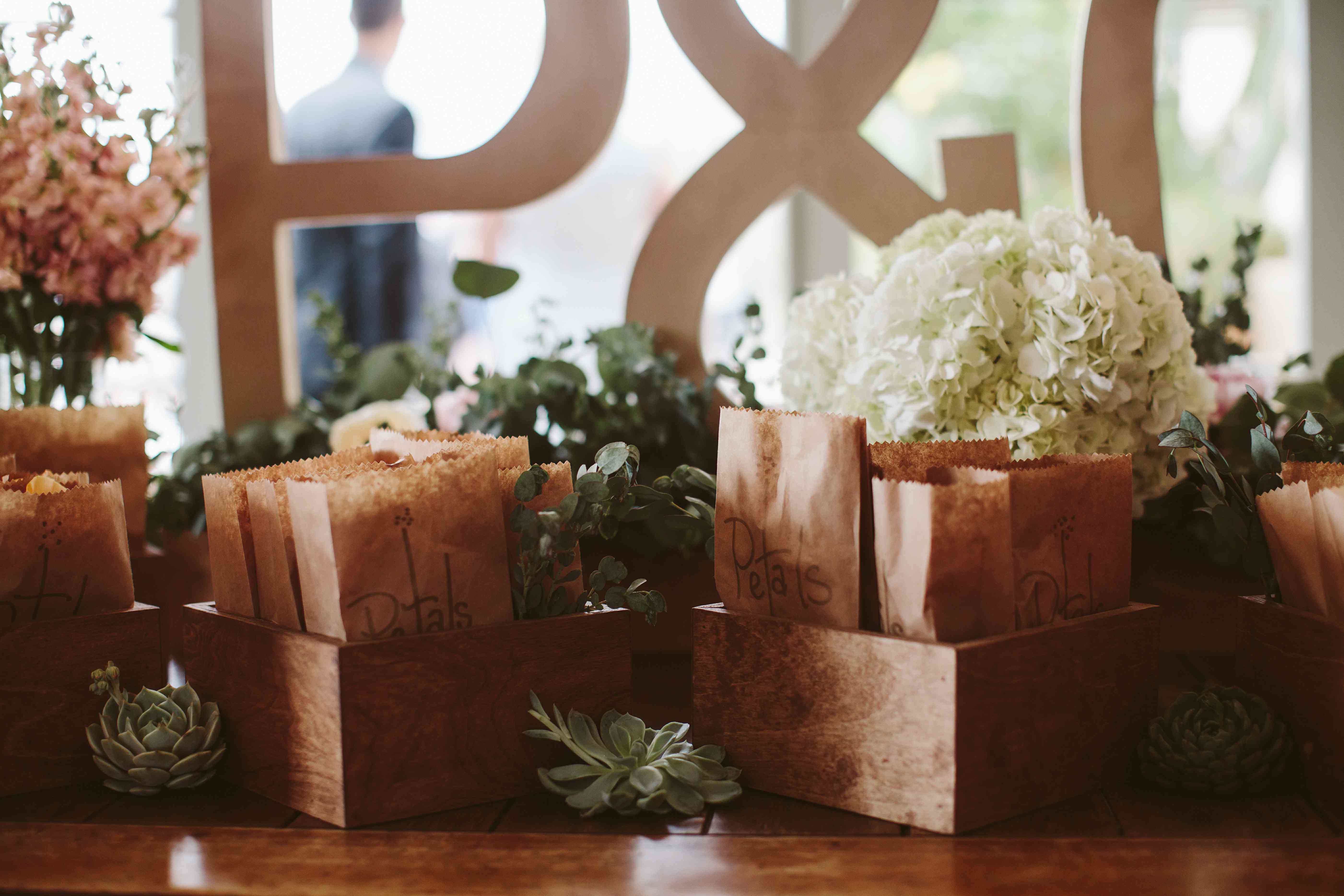 在来宾们就座之前,帕纳约蒂和凯特琳说了“我愿意”之后,他们就会在花瓣吧台前停下,拿起装满玫瑰花瓣的纸袋,然后将其抛撒。
