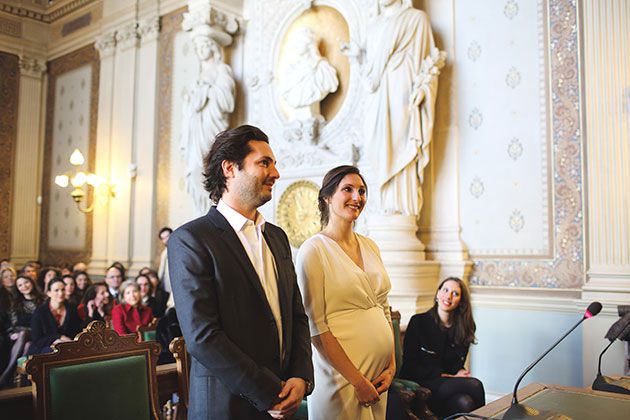 Amélie和劳伦特官方制作了民间仪式在巴黎的第一个Arrondissement的法院大楼,被朋友和家人包围。