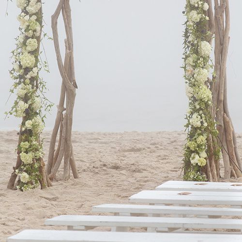 为了提升海滩的自然美景,这对夫妇让装饰简单。他们在漂流木Chuppah下面交换了誓言装饰着白色和绿色绣球花和花园玫瑰和坐在沙滩上简单的白色长凳上的客人。