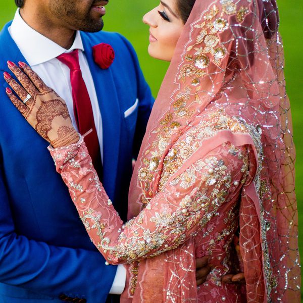 不要害怕尝试你通常不会喜欢的东西。你可能会惊讶,保持搭配搭配并不总是与你的礼服相配的最好方法,这取决于你想要的外观。“有时候,混合纹理是添加一些创意的好方法,”Abedi补充道。“例如,蕾丝花边的面纱搭配一件非常干净的礼服。”
