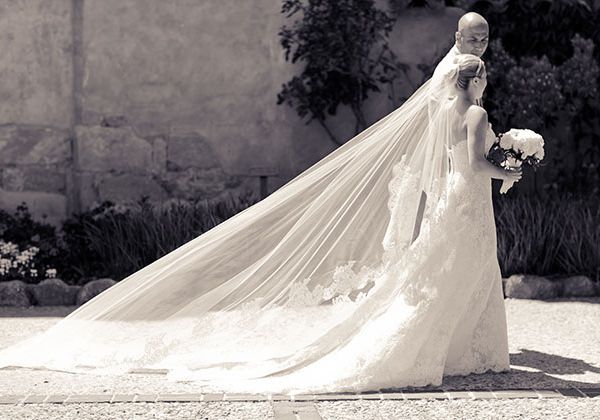 要想进入最富丽堂皇的入口,你必须有一个大教堂那么长的面纱。“教堂长度的面纱延伸到新娘礼服的裙裾之外,是最引人注目的婚纱长度,”卡拉维拉说。