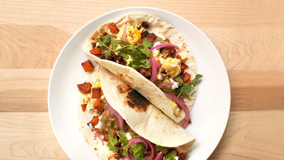 对于玉米饼:热油在一个大平底锅中火加热。煮香肠,打破了肉和偶尔搅拌,直到变成褐色脂肪被渲染,6-8分钟。用漏勺,转移到香肠纸巾漏(不倒掉从煎锅脂肪)。加入红薯回锅,煮,偶尔搅拌,直到金黄色,嫩,8-10分钟。在混合辣椒粉和辣椒,赛季黑胡椒,煮,搅拌30秒。用漏勺,转移到纸巾漏;加盐调味即可。与此同时,拂鸡蛋在一个大碗里,以共混物;赛季盐和胡椒。高温黄油在一个大的不粘锅,中火加热。煮熟鸡蛋,偶尔搅拌和刮用耐热锅铲,形成大凝乳煎锅的底部,直到刚刚成立,约3分钟。从火上移开,并在香肠混合。装满蛋液和甜薯顶部石灰克雷马,粘果酸浆莎莎,和香菜玉米饼。