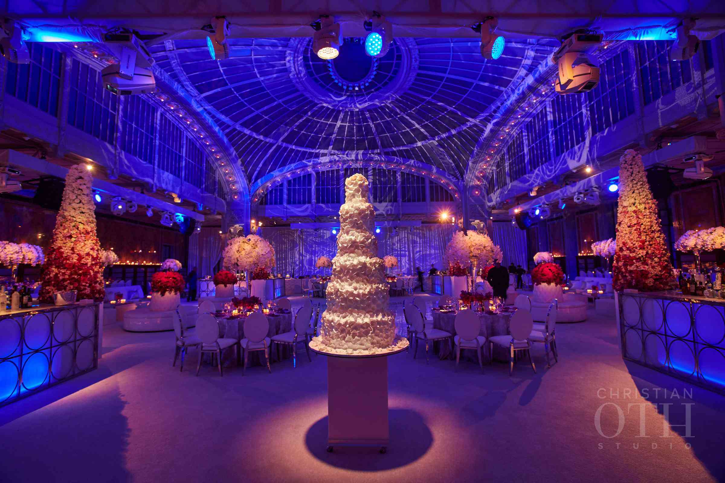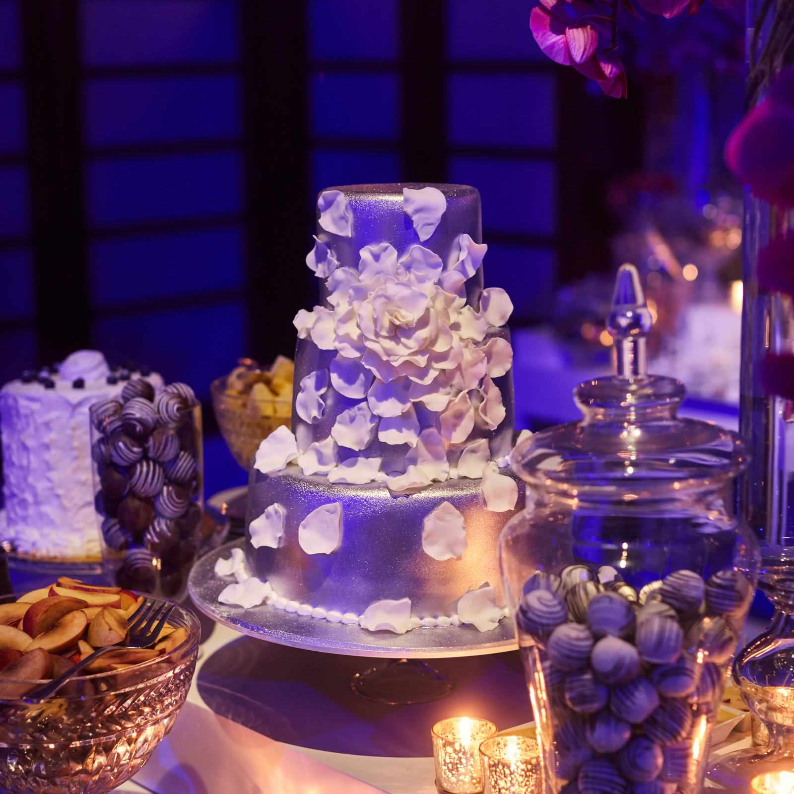 在内部,论坛被蓝色和紫色的灯光照亮,燃烧的蜡烛和花朵图案投射在墙上。桌子上的白色兰花层层叠叠地插在透明的花瓶里,而吧台则用高耸的ombré粉色装饰。圆形的长椅环绕着舞池,上面点缀着紫红色的兰花。不过,婚礼的中心装饰品是高耸的婚礼蛋糕:香草椰子甜点,上面覆盖着方旦糖花瓣。